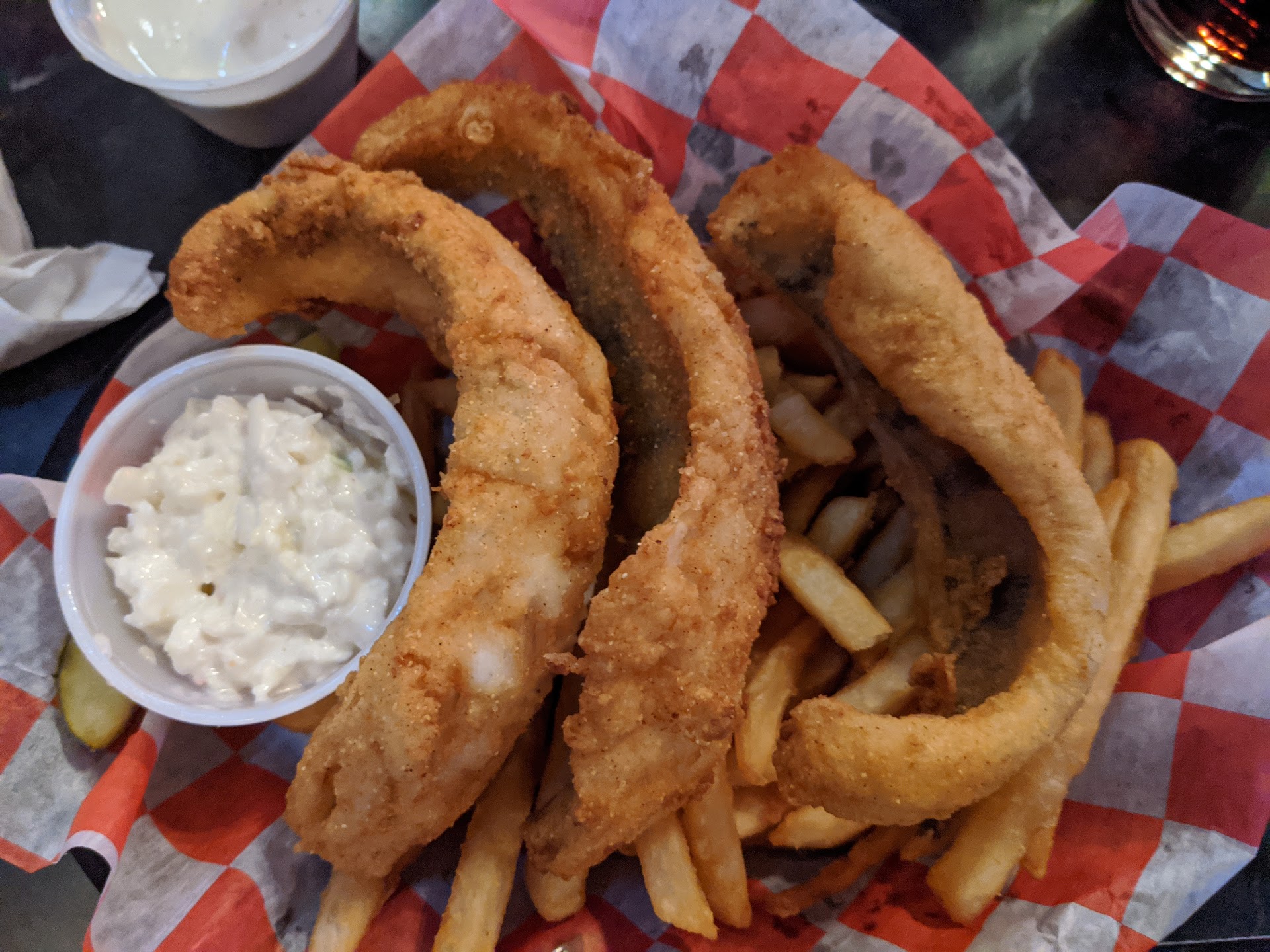 Read moreI stopped in to grab a quick bite with some friends. The place is cool looking and the service was good. I got some popcorn and ordered the parmesen garlic fries. The popcorn was so salty, you'd think it just got cheated on. I mean completely inedible. No biggie. Was more excited about the fries. Well, they are actually pictured in the bar pics and if you look close enough at the pic, you will see my gripe, they literally come in a pool of oil. I'm not talking like some oil that dripped off, I'm talking like 3 or 4 cups of oil! Like why?????? Anyways, I eat a couple of these bad boys and noticed they were especially oily after 5 or 6. Then I noticed the ocean of cholesterol at the bottom. Long story short, I made in a quarter I. The basket before I didn't feel good and I was violently sick for 2 days after. And I mean bad! I was say go here for the drinks,...