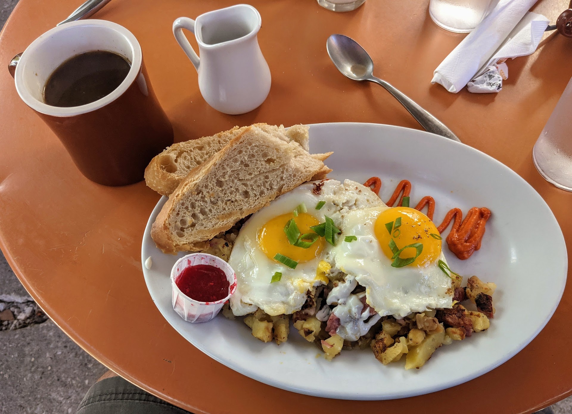 Read moreThis may be the best scratch breakfast in Northern Michigan. The seating was outdoors only, 4 tables in the back patio/garden area. This was glorious on a sunny fall day, but may be problematic in inclement weather. However there was a cute to-go window for dining elsewhere. While absolutely everything on this menu looked and sounded delicious, they make their own pastrami. If you follow my reviews at all you know I am a pastrami/corned beef connoisseur. So as scrumptious as the monte cristo, chorizo sausage and gravy and french toast all sounded, the pastrami hash on the special board was screaming my name. Alas it did not disappoint, tender pulled pastrami, grilled seasoned russet potatoes, a piped red pepper sauce and 2 eggs over easy combined to make a savory world class hash. The sourdough toast with the freshest raspberry jam was the coup de gras of this breakfast. Absolutely delightful! The french press coffee with real cream was a perfect pick-me-up. And my friend seemed to revel in his fresh crepes places in a pool of amber Michigan made maple syrup. This is one of those meals that will stick with me for a while. Service and ambiance were too notch as well. Ever since Golden Harvest closed in Lansing's Old Town neighborhood last year, I've been craving my scratch hash fix. Now I just need an excuse to drive 2.5hrs back up to TC to visit again. Highly recommend! Bring a few quarters for the...