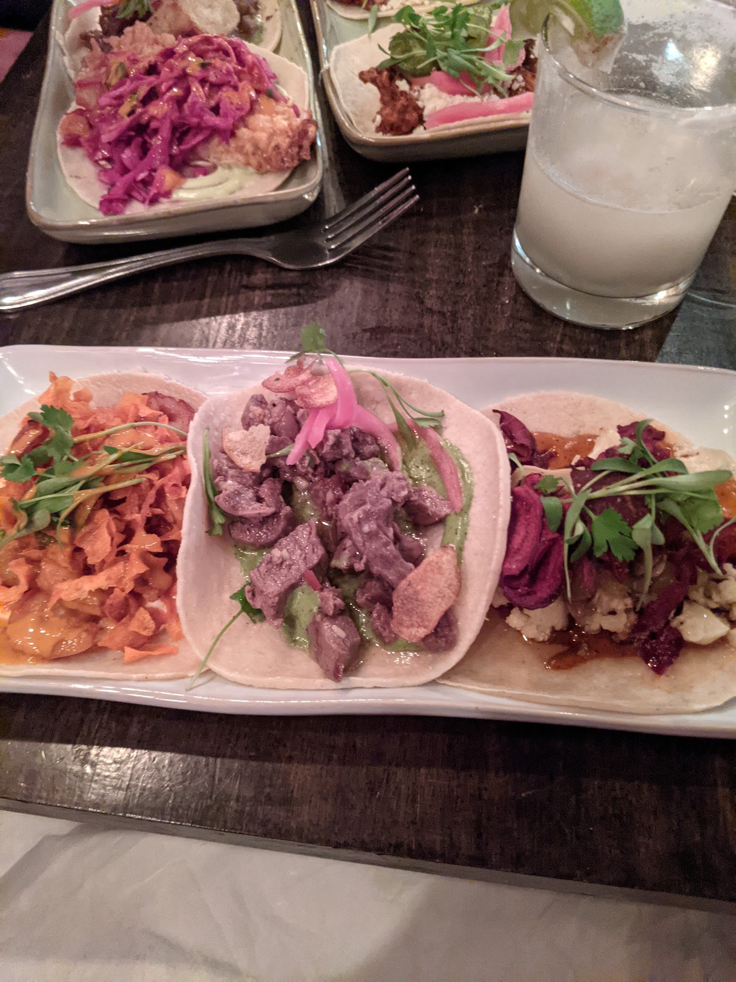 Read moreI tried the beef, shrimp, and vegetal tacos along with the guacamole and a coconut margarita. The guacamole was very fresh and minimal. The avocado was the shining star, unlike some places that mix in a lot of ingredients. It went perfectly with the margarita. I liked my choice of coconut flavor, it was not overly sweet, nor was it artificial tasting like some coconut drinks. I loved the smoked jalapeno crema on the steak taco. The meat itself was a little salty for my preference, and the chip on top was strange. Overall, a good taco for steak lovers. The Vegetal was a unique flavor combo, and worth a taste if you like to try something "different". I liked the savory/sweet combo. I liked the little spiciness in it. The shrimp taco was my favorite. Any seafood lovers out there won't be disappointed.