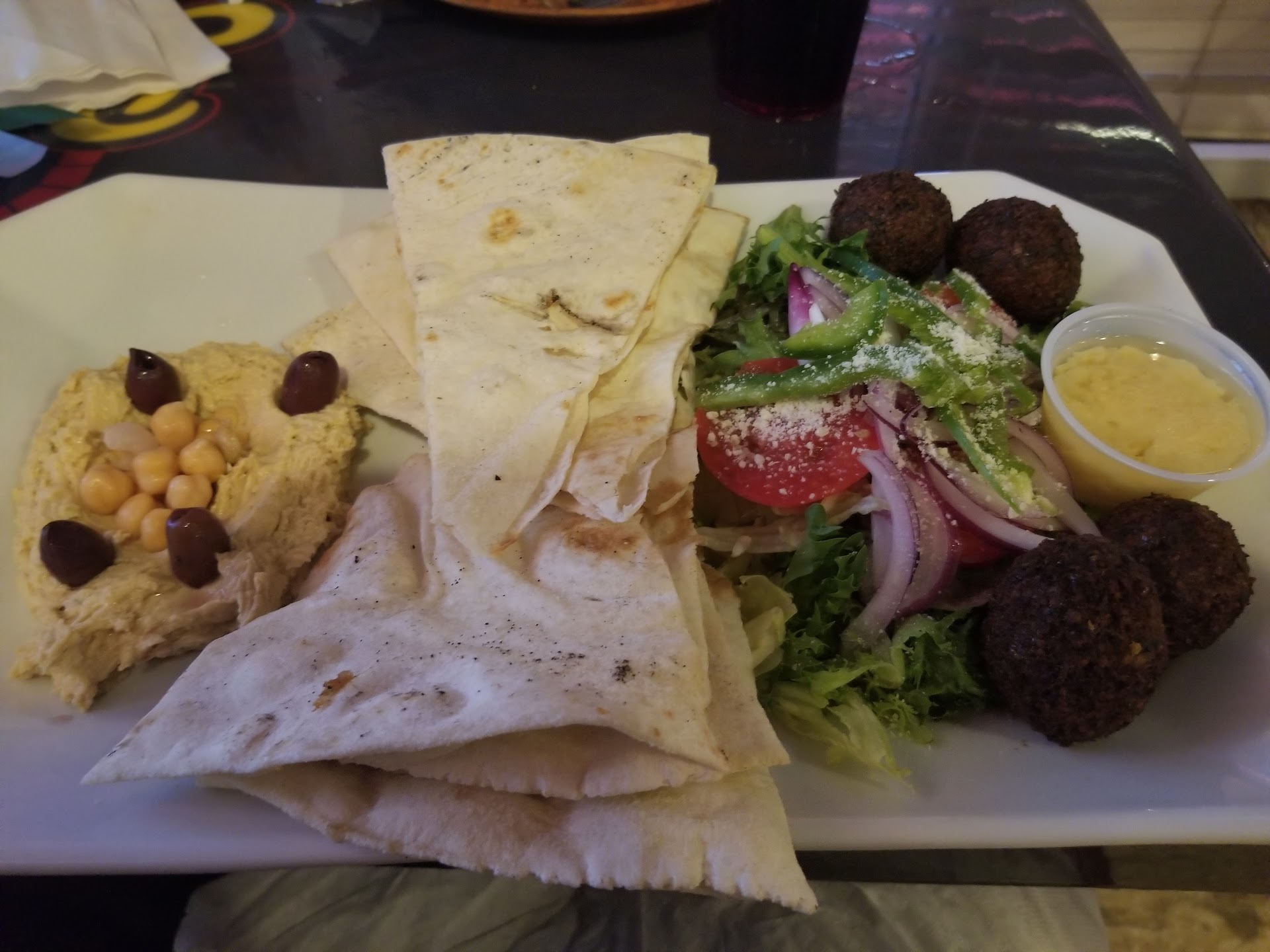 What a surprisingly yummy place we stumbled upon from the beach!! Parking is less than ideal, but once you get in, you're in for a treat. The service was so great. Tina, our server, was happy, cute and attentive. Clearly loves her job, which is comforting. She checked on us many times, gave us drinks before we had to ask, and offered her opinion on dishes, which worked out perfectly. We had the hummus appetizer and let me tell you...it's a must get for every visit and can be a main dish for me. It is served with a small salad and the best pita bread I've ever had. The points were crispy and the ends were soft. We also ordered the Margharita pizza and the HUGE Grilled Chicken Cesar Wrap. The pizza was good but we wanted way more basil on it. Just a personal preference as the pizza was cooked to perfection. Their pizza crust and pita bread are absolutely superior to all others I have had. We wanted to get an order of pita to take home (major fail on our part). I have to admit the absolute best was the chicken Cesar pita wrap. Tina said it takes 3 people to make it bc it takes 3 stages to make it! The blackening spice on the chicken was perfect. The lettuce was cold and crispy. And again the pita was warm, fluffy and melted in my mouth. Took 2 of us 2 days to eat it, but totally worth it. We tried to order Uber eats the next day bc we loved it all so much. Highly recommend this cute spot on the beach in Treasure Island. Our new go-to place...