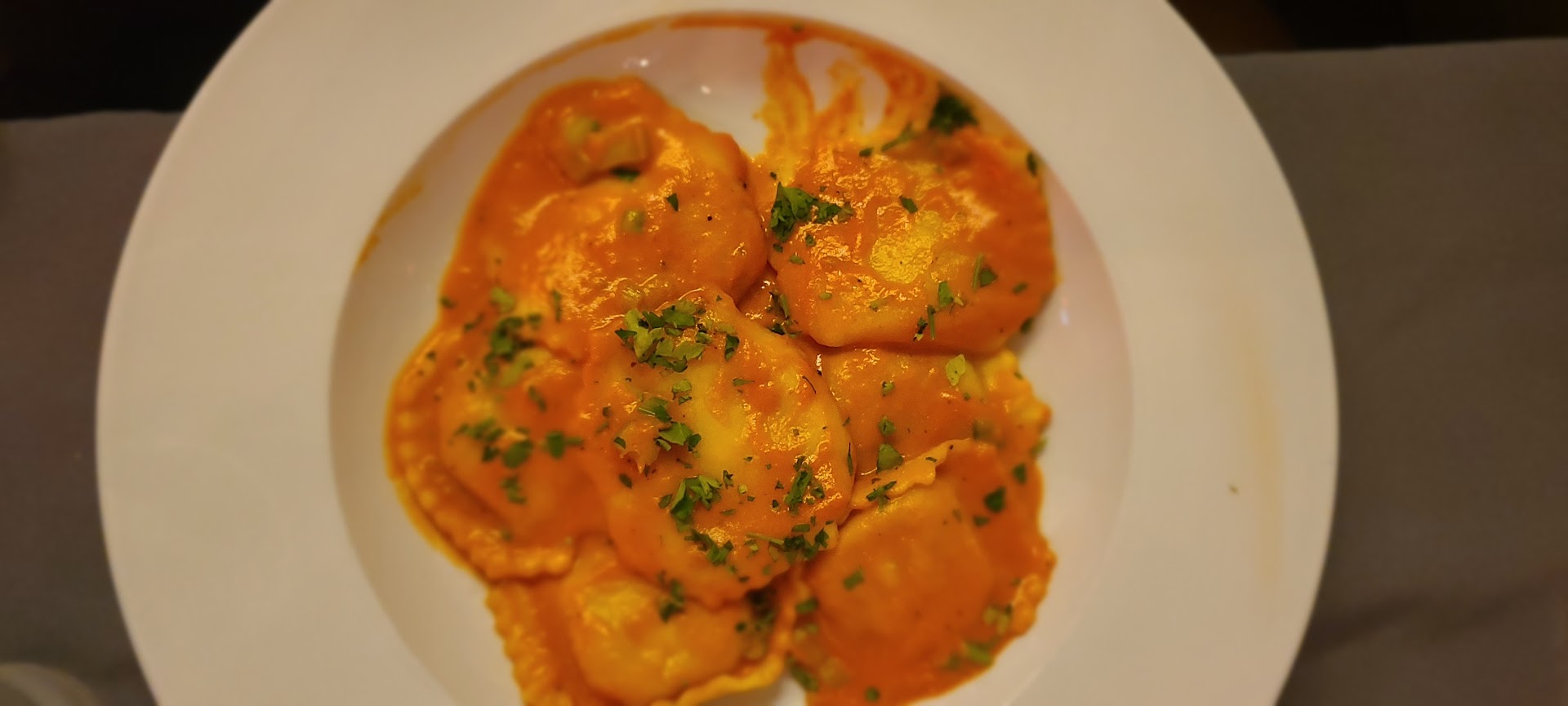 The food was good. We started with the recommended Bruschetta. It isn’t typical. Instead, the topping is in an accompanying bowl. The topping was delicious—how can you go wrong with tomatoes, basil and garlic in balsamic vinegar? We then shared a bowl of their special tomato bisque and it was delicious. We also shared a Caesar salad which my wife thought was too garlicy (I’m not sure that’s possible), so I ate her share. The server had asked me if I did or didn’t want anchovies on my salad so I said sure, but on the side. I had no idea that I’d be charged an extra $2.50, especially since it didn’t say that on the menu. Shame, shame.