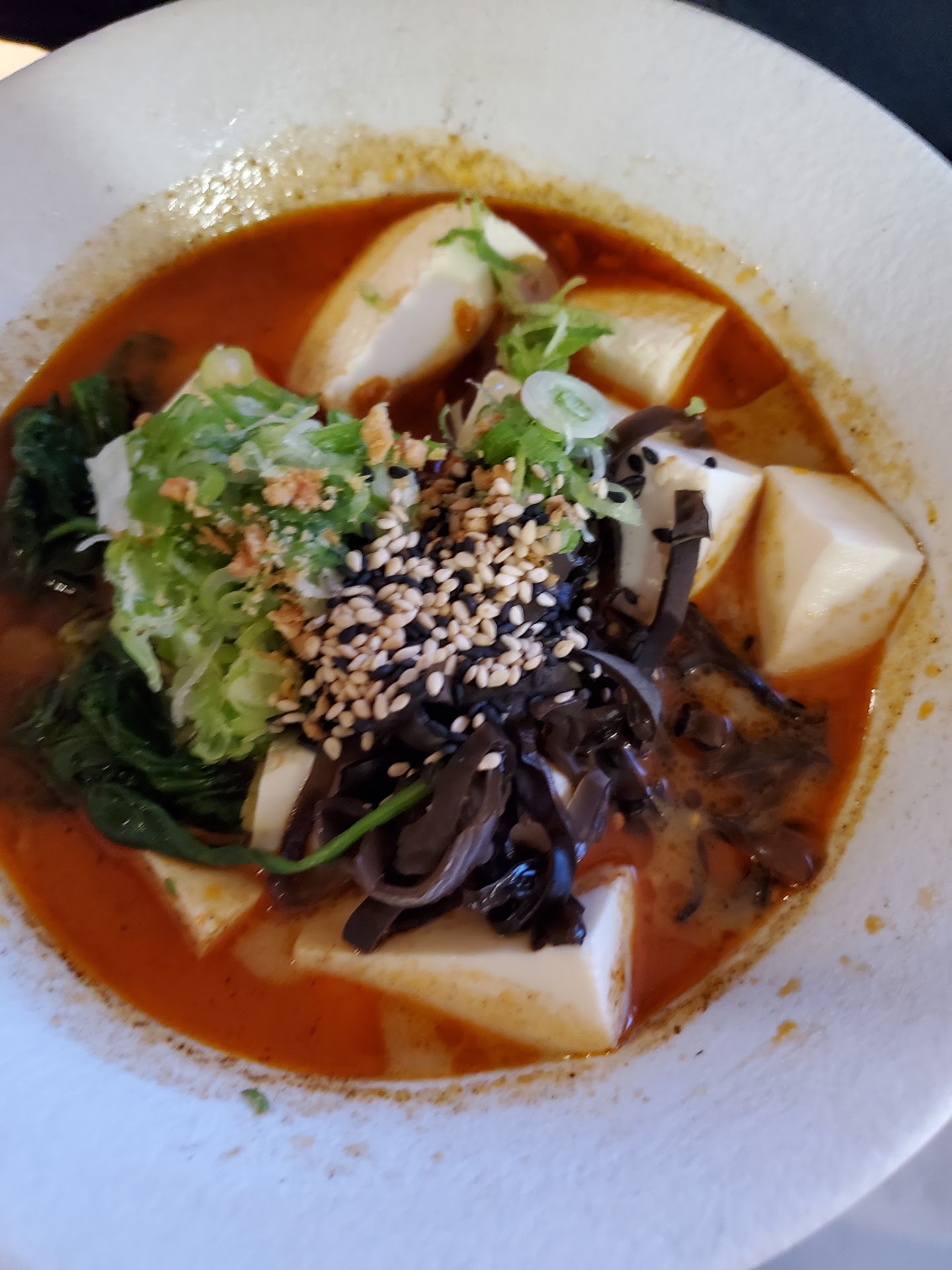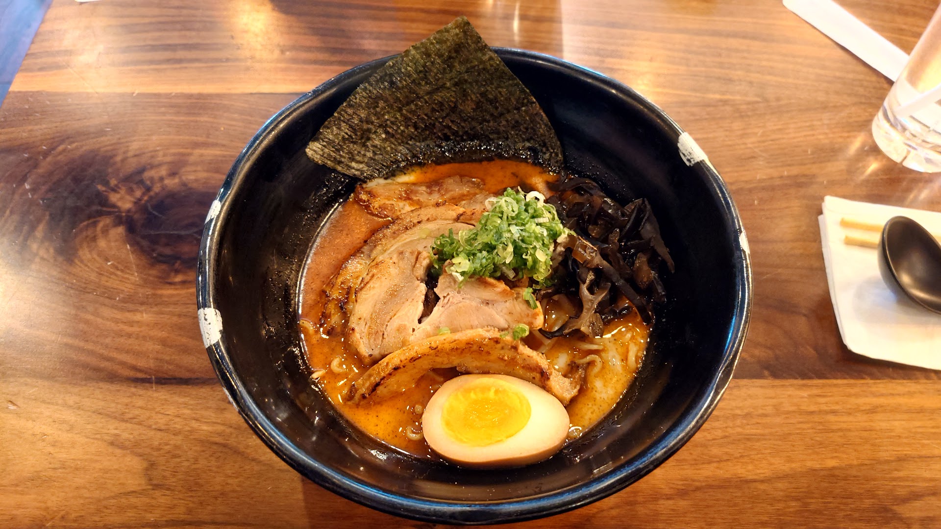Here's my "let me level with you" part of the review, mostly for the owners. I love ramen, for a lot of us we grew up with instant and when we first discovered ramen bars/shops we gained a new appreciation for it. It's like the ultimate comfort food for me, so I want to see more ramen shops and as such I want to see places like this be successful. I love ramen so much and reviewed so many ramen spots that I'm actually planning a ramen tour in Japan for 2025. That said however, to me ramen doesn't need to follow strict rules or even be Japanese in origin (considering ramen itself originated in China). I've had ramen from Japanese, Chinese, Korean, and American born owners and all of the good ones bring something to the table. My concern here is that the flavor is potentially being turned down to accommodate local tastes but that's a huge mistake, just focus on making your best bowl of ramen. The Hakata Black for example was good because the additional flavors carried it, I could tell the tonkotsu broth itself was a bit underwhelming, which was odd because parts of it still seemed rich. Perhaps this is a dashi issue or it's frankly watered down a bit I don't know but the flavor was definitely muted. I assumed the additional spice from the spicy would make up for this but apparently it did not, and the person who ordered it didn't find it very spicy and they don't even have a particularly high spice tolerance level. I don't think it's bad it just isn't good. The chicken wonton ramen on the other hand is a total miss, it just tastes like nothing. I noticed the person in my group wasn't the only one to say this so I really think it's something worth looking at. At the end of the day if you believe this is your best bowl of ramen, and you are serving exactly what you intended... Ignore me. At the end of the day you know your business and if you think we're wrong that's absolutely fine. Because of the varying experience of my group I'm leaving a 3 star review and when I leave 3 or lower I tend to like to elaborate why. Ultimately my complaints are muted tonkotsu broth, my ajitama was edible but I prefer a gelatinous gooey yolk (soft boiled), which was not what I got and the noodles were a bit clumpy (which tends to happen if the noodles aren't separated enough when cooked at very high boil (they like fuse a bit). That's my two cents, do with it what you will and regardless I hope your business lasts years to come. We...