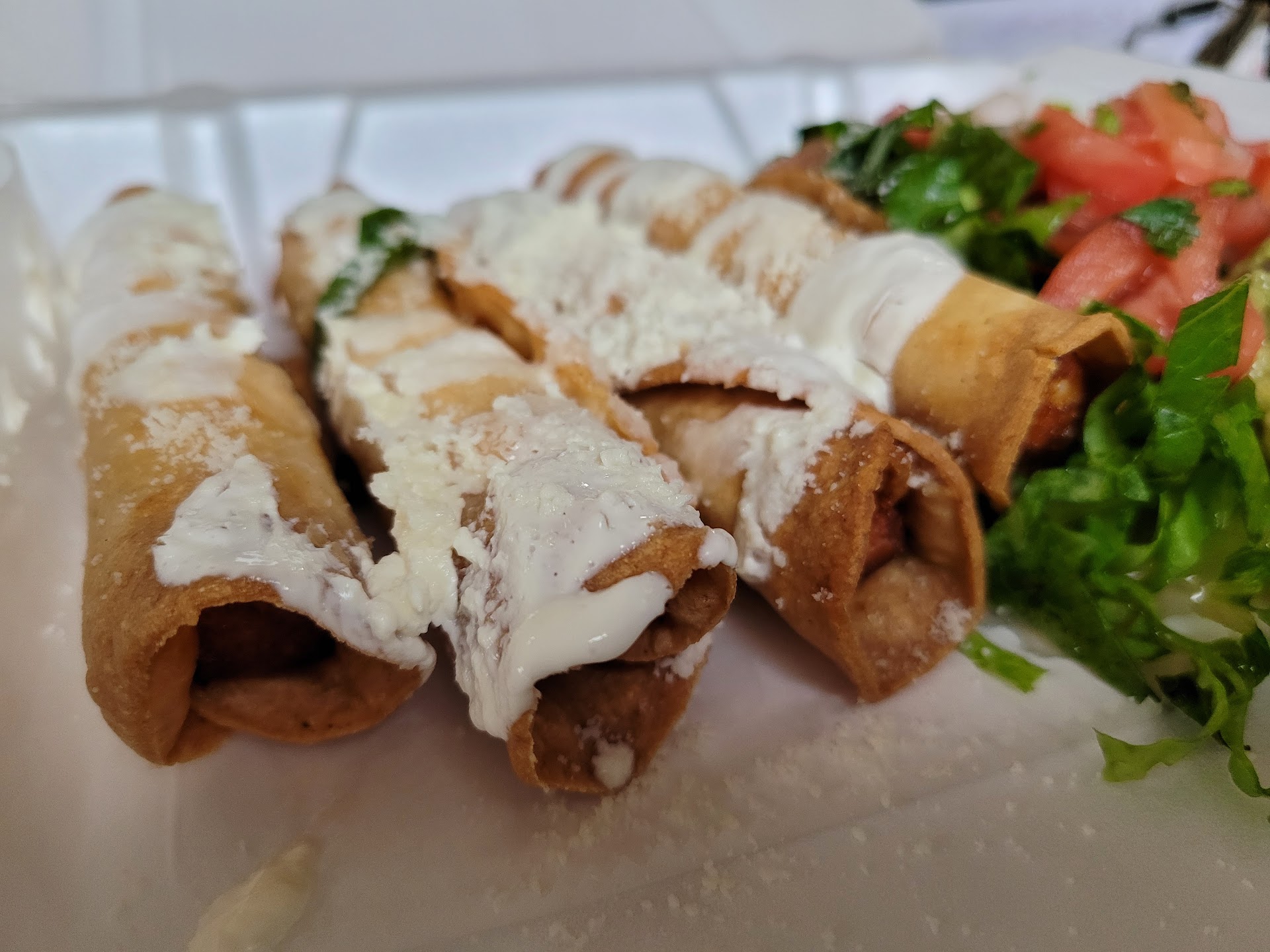 The cheese flautas are a treat. They are a guilty pleasure, crispy and cheese filled. Dip them in the green salsa. You're welcome. 😃