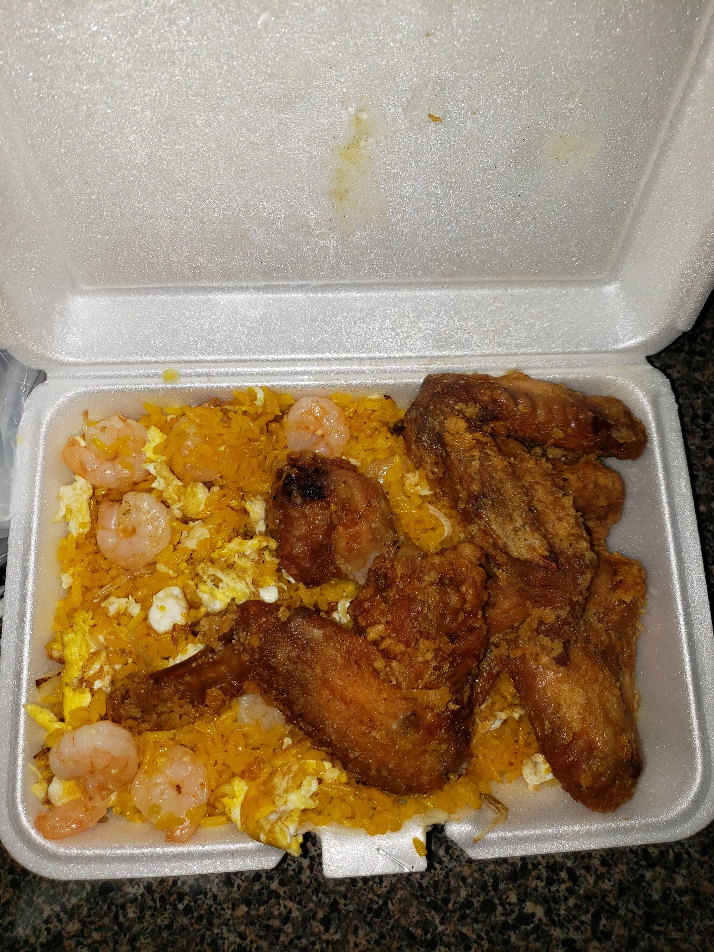 I ordered from here for the first time it was delivery I asked for shrimp fried rice with onions no Vegetables in 6 chicken wings fried hard when I got my food the chicken wasn't no where near fried hard half cooked in the shrimp wasn't cooked I asked for dollar extra shrimp no onions in the rice wasn't fried horrible I called to report it in they told me sorry they busy manager not there in hung up on me I called again in was very polite about it in ask for my money back in they put me on hold on never picked the phone back up then I hung up in tried calling back the line was busy till they closed never again very rude people in food...
