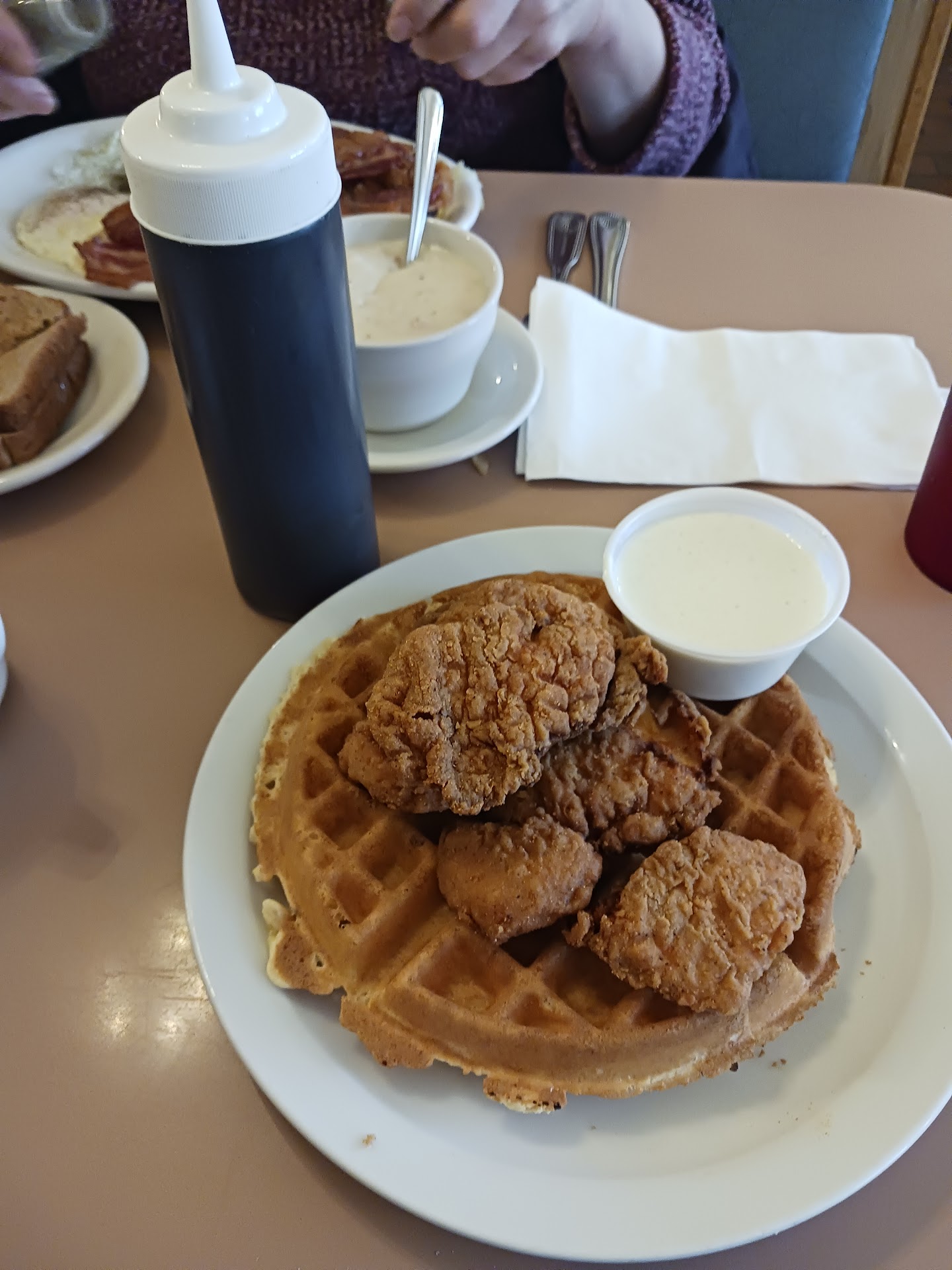 Just came to Mom's this morning (Christmas Eve) it was our first time but my in-laws and other family have been to Mom's before and love it! Prices are VERY good, atmosphere is very inviting and the overall look of the restaurant I love.. very important to me is the bathrooms and they were very clean and warm! I didn't catch our waiters name (tall guy black hair looked Hawiian) he was absolutely AMAZING! Very fast, nice, precise, always on top of refilling drinks and checking on us! The guy who took our drink order and was bussing tables was equally as amazing I didn't catch his name either (I wish they had nametags or something lol) they both deserve a million dollar raise seriously! He brought our drinks and I forgot to order a coffee he had it sitting on the table by the time I came back from the bathroom to wash my hands and it was so hot and good! There was 9 of today and both men did so well dealing with us all haha! Anywho some of us got eggs, bacon, sausage, toast, french toast, pancakes, strawberries, hashbrowns and biscuits and gravy.. no complaints whatsoever the eggs were cooked perfectly, toast was buttered, the biscuits and gravy I had to add more pepper and a little salt but that's just me 😁 so good and so filling! The biscuits looked like they were made from scratch they were really good!.. we will...