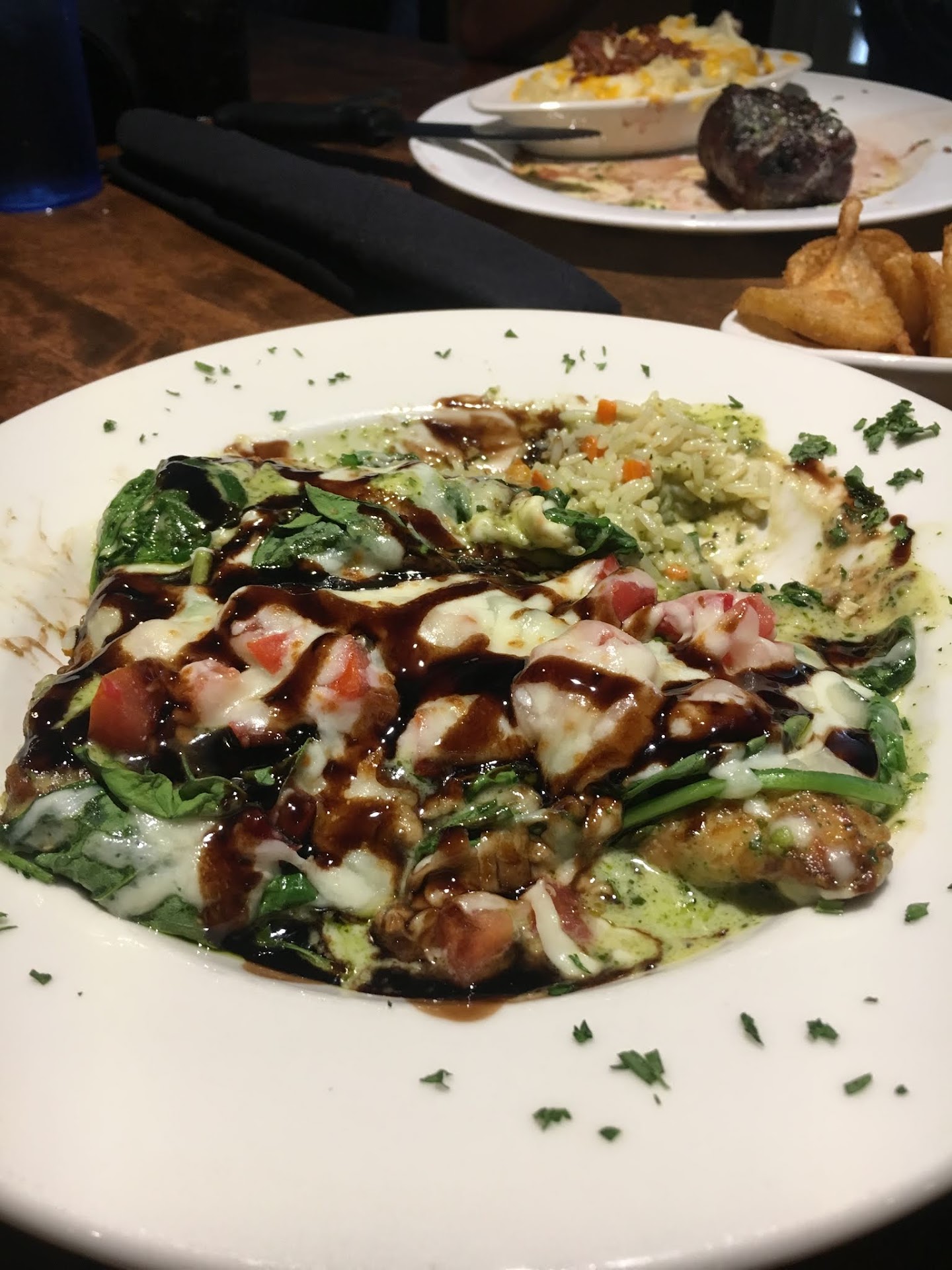 We got there around 7:30 on a Wednesday, so it wasn’t busy at all. Our server, I think her name was Joelle or Joann, had 2 tables of 2, including us. We sat down and waited about 10 minutes to be greeted and get our drink order, then about 10 more minutes for our drinks (water) to come. We ordered the spinach artichoke dip. The runner brought it just a few minutes later. The server also asked if we were ready to order entrees. My boyfriend asked for just another minute. The spinach dip had golf ball sized artichokes, super long leaves of spinach, and just a huge glob of cheese. Very difficult to eat.