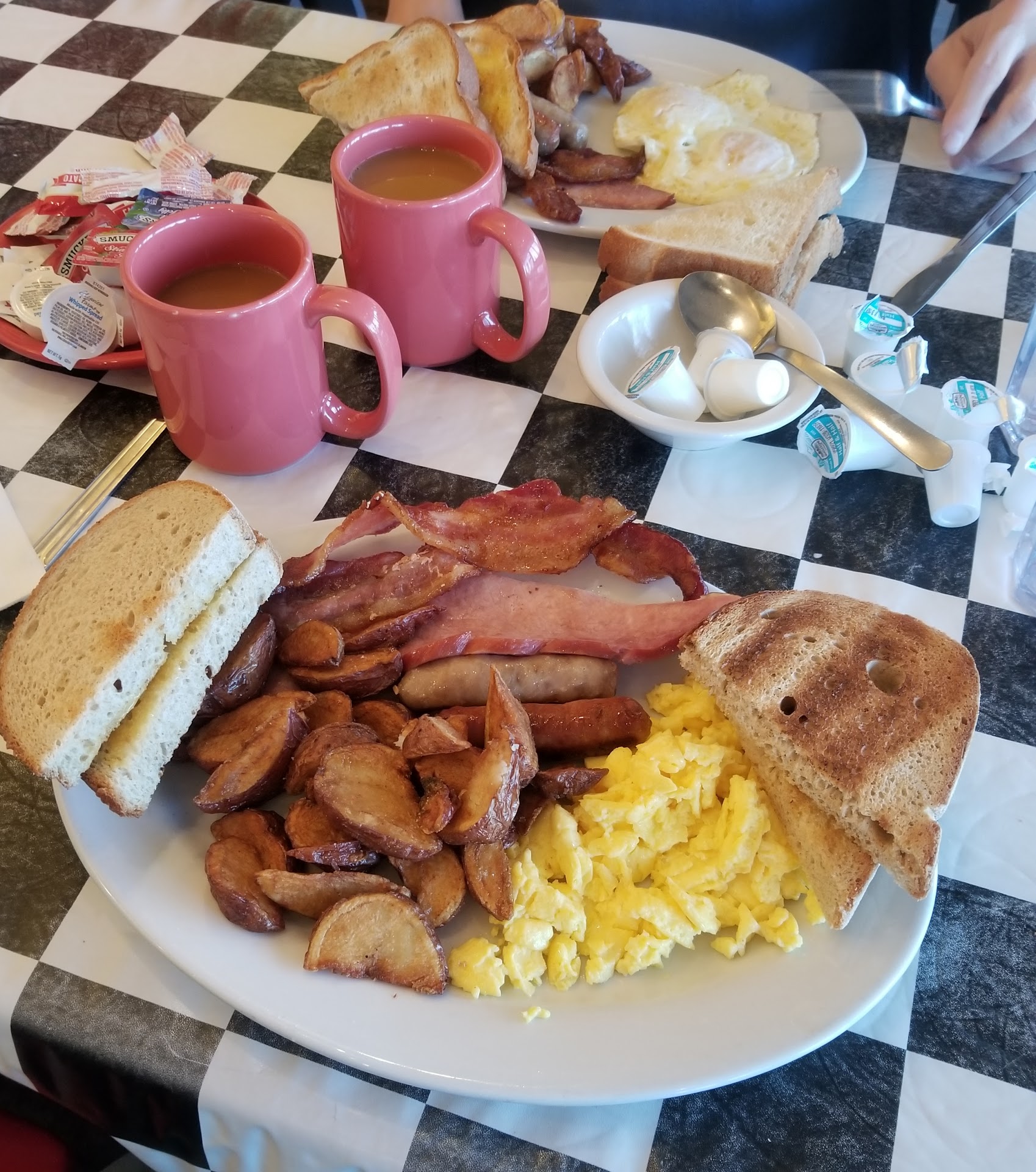 My visit was on a Thursday Morning at 9:00. I was immediately greeted upon entance.Given my choice of seating and offered a coffee or other beverage along with a menu. My waitress “Christina” was very pleasant, proficient and likeable. She actually seemed to enjoy her job. I chose the Western Scramble “Ham Green Peppers, Onions mixed with Scrambled Eggs & Cheddar Cheese and cheese grits”. Coffee was extra. It was very good actually a decent amount of veggies & ham in the eggs. The grits were excellent a small mound of cheesy creamy grits and covered with crispy blanket of additional cheese. The English muffin was thicker than most and very good. (They also have “Smuckers” products and have Apple/cinnamon jelly which is never usually found. They usual offerings are Grape, Strawberry, Mixed and Orange Marmalade). I was tempted to go for the Green Eggs and Ham as a tribute to my favorite childrens author but maybe next time. The menu is different than all the other places in the area. My only small complaint is that they open at 9:00. I am an early bird and like breakfast soon after I awaken. And the prices are on the higher side but the food is worth it.