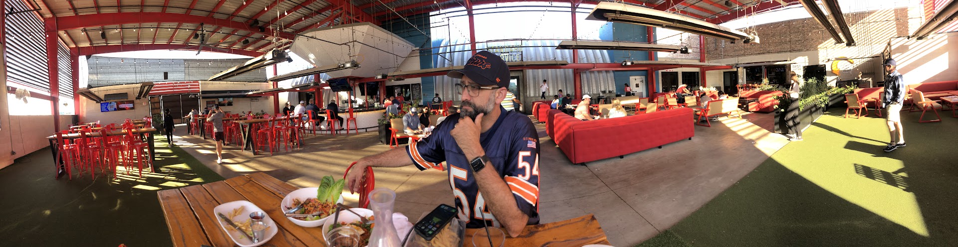 ATMOSPHERE - Excellent. Open outdoor area with lot's of lights and games like shuffleboard, ping pong, and cornhole. Heaters for when it is cold. Many TVs showing sports.