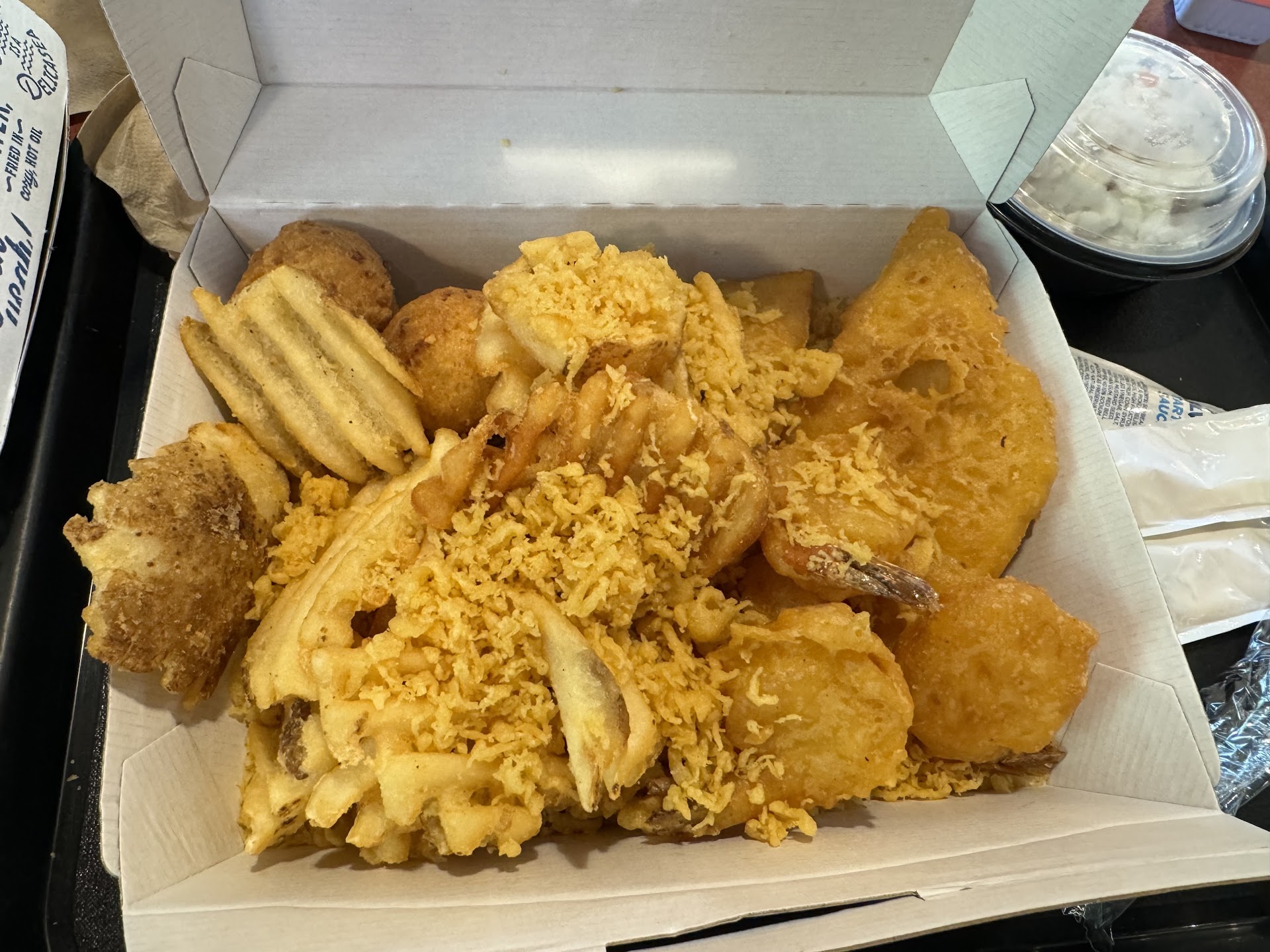 Read moreWent in to Long John Silvers for lunch again today hoping for the best. My last several visits have been disappointing. I stood at the counter waiting to order. The self-service kiosk is only for the Taco-Bell at this location. Three groups were able to order for Taco-Bell and get in front of me before anyone in the restaurant staff acknowledged me. I made my usual order of a two piece fish and fries with a drink and I asked for a small container of the batter drippings (crumblys, crunchies, crumbs.) I used every word I knew to refer to the crunchy batter nuggets of goodness. The register attendant did NOT understand. Eventually he said, "crunchies, yes." I thought that meant he understood. Later I found that not to be the case.
