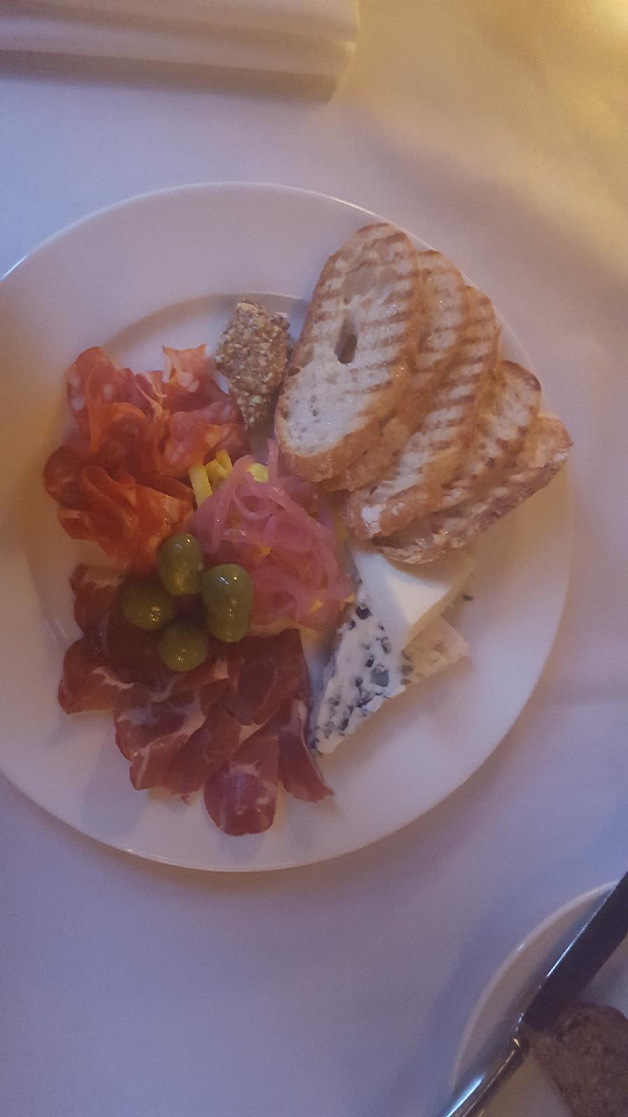 My husband ordered the Wild Boar and the soup of the day, which he enjoyed… I ordered the New York Steak with marsala mushroom sauce (medium rare), fingerling potatoes and braised greens… The steak was closer to medium or medium well and VERY gristly (although the marsala mushroom sauce was tasty)… The braised greens were so salty they were inedible. - Our server was very courteous when I brought these problems to his attention and offered to bring me a new dinner… However, in the time it would take to make me a new dinner my husband would either finish his and we would each end up eating alone, or he would wait for me and eat his dinner cold. In the end I did the best I could with the gristly steak and the server brought me a new serving of greens…