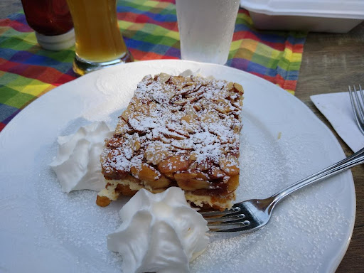 My dinner was delicious! The schnitzel was very tasty and the French fries were the bomb! Nice and crunchy! Large portions and I boxed up half to go. However, I also ordered dessert the portion was huge and the cake was very moist and the cream was between the two layers of cake. I loved the toasted almonds on top. It was one of Anita's kuchen specials. Had to have a take out container for half of the dessert.