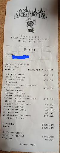 I called for carry-out and the young lady answering the phone and taking my order was simply superb. She was extremely professional, courteous, friendly and just plain sweet. I placed my order for a full slab of baby back ribs, a la carte, with extra barbecue sauce. Upon arrival, I was greeted by a young man and the same young lady. They were OUTSTANDING! My order wasn't quite ready so I waited in a seat until it was...I arrived pretty early so it's definitely not their fault that it wasn't ready. A few minutes later another young lady brought out my order, confirmed it was mine, and I left with a really great feeling about the treatment I received and the crew that was working. Unfortunately, that's where the good feeling ended. I drove all the way home to enjoy my baby back ribs (and my first time getting food from Blazin Bills) and discovered that I didn't have any extra barbecue sauce on my ribs as I'd ordered. But, ribs iz ribs so I was still happy to tear into them. That's when I discovered that the entire slab was EXTREMELY tough, and you really had to TEAR them apart from the bones. Normally, even when I make them myself, they simply refuse to stay on the bones and practically melt in your mouth. Not these. Once you tore a bone off the meat was extremely tough, like it had been WAY overcooked but not in something that would break down the connection to the bones. Just plain TOUGH. I'll admit, they were very tasty, but definitely NOT worth what I paid for them. Then, on THREE SEPARATE OCCASIONS I found little hairs at the end of three of the rib bones when I tore them apart. They can't be mine, I have a military type "high & tight" haircut with none of my hair being more than ¼ inch in length and each of the three hairs ranged from ½ to ¾ of an inch long. I simply put them aside and didn't raise a huge stink about it because they were at the very ends of the rib bones, and that wasn't going in my mouth, anyway. All in all I'd have to say this was a GREAT DISAPPOINTMENT for my first time eating here. While the staff and service were SUPREMELY FANTASTIC, the baby back ribs left A LOT to be desired and were absolutely not worth what I paid for them. VERY SADLY...