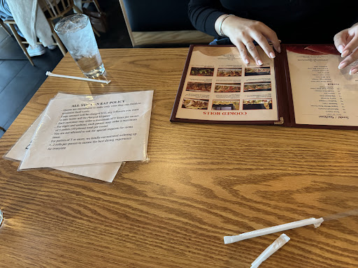 The customer policy is posted at the front check in desk which okay, but then they also place a copy of it at your table too with your menus?? When our first round of food came, he was having trouble making room on the table and tried moving the policy to the side and I said oh you can take that sheet, we know how it works, and he tried to deny taking it away at first like he didn't trust us??
