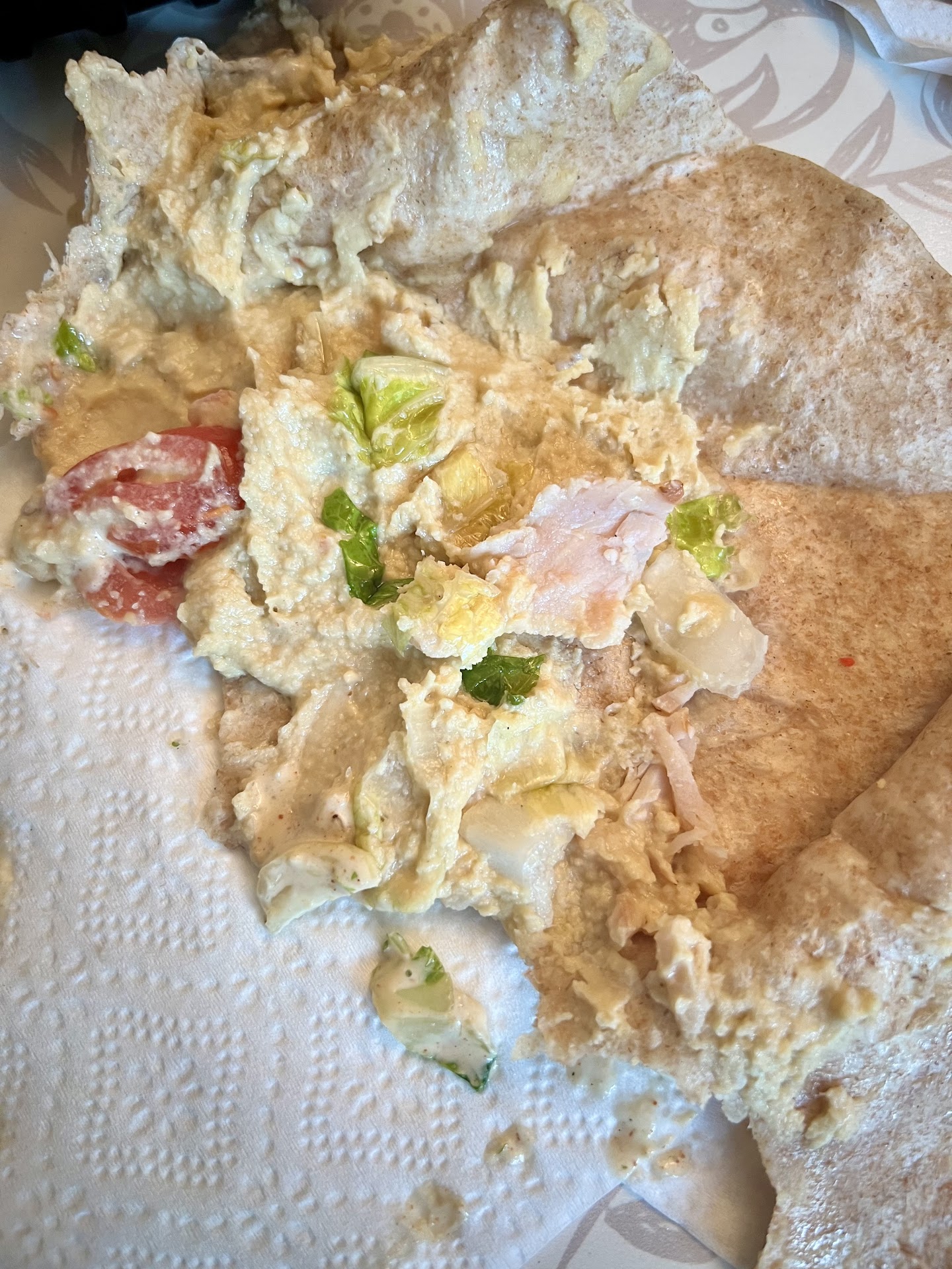My avocado turkey sandwich was SLATHERED in hummus that it initially made me think it was a tuna sandwich when I first opened it. It was MISSING avocado, like 98% of the romaine lettuce, cheese, and like 95% of the turkey! I couldn’t even eat it cuz who would want to eat a hummus filled pita?! The picture shows the literal ONE piece of turkey!