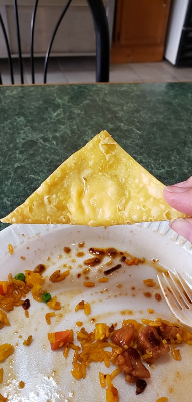 The egg rolls were GREY on the inside and the crab rangoons have NO filling. (this has been the case every time I have eaten there over the past several years).