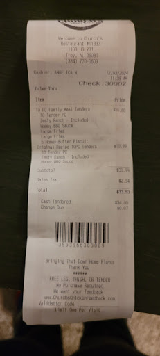 Read moreWe google restaurants in Troy Alabama on our way to Huntsville, Alabama. Seen there were a Church's close by we stopped to get a bite to eat. My son and I ordered 2, 3 piece specials and we had to wait 20 minutes before they bought out our meal. We were going through the bag before leaving notice that's they forgotten the french fries and when my son returned inside the store to get them. The young lady told my son that we only ordered one special, she tried to give him a hard time when we order two specials. She the (drive-thru worker) got an attitude for no reason. He showed her the receipt and we had to wait another 20 more minutes before getting the french fries. She didn't apologized for her mistake. Management needs to teach her Professional courtesy something she doesn't have. If it were me I would've asks for my money back but I didn't pay the bill. Find another chicken place to go to stay away from Church's in...