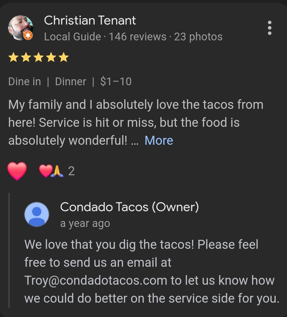 We finally got our food about an hour and a half after arriving. I am vegan, one of my friends has a dairy allergy. My food seemed to be correct, but my friend ordered the kale bowl and soy chorizo taco. She instead received a rice and beans bowl and some form of loaded soy chorizo taco -- both items which contain dairy. Someone who I think was the manager finally came around, my friend explained the mixup and her correct order was received. That same friend ended up having allergic reactions to dairy and she thinks there may have been dairy in the new order she received as well. The manager ended up comping a percentage of our food and giving us vouchers for one free taco at that location. My friends aren't exactly excited to use them there and I don't blame them, but I'm willing to give the location another chance once they've gotten used to COVID restrictions and hopefully have more staff.