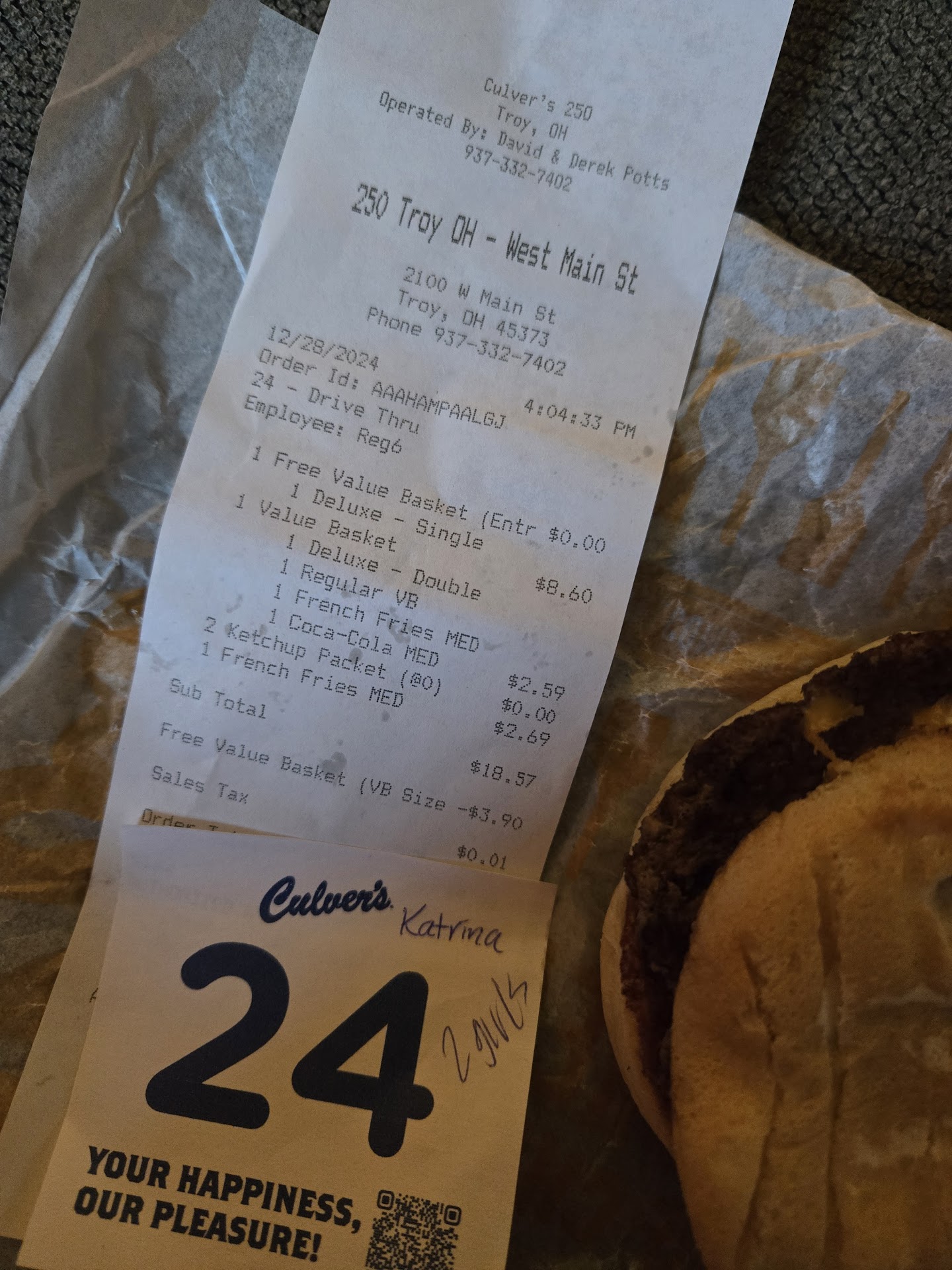 Read moreWent to Culver's in Troy a week ago. Spent $40+ and drove back to Piqua before I realized that they forgot 2 burgers. Not cheap burgers either. Called them and instead of telling me to come pick them up, they said they would send me a coupon in the mail. So my daughter and I had sides for dinner(pretzels and fries). Today I take my coupon for the food I already paid for and the Manager Katrina said that the coupon only was for one sandwich and refused to give me all my food I had already paid for and waited a week to get reimbursed on. Katrina said that i should have kept my receipt. Even though they sent me a coupon. To make it worse 2 teenage looking girls stood behind the manager at the window laughing and talking about me trying to get my food. I asked Katrina their names to include in the complaint but she refused to give the names. I asked for the General Managers name and she said it was Cheryl, but she was not in today. Very frustrating. All I want is what I paid for. Not sure how to get it. Plan to call the GM, call corporate(closed until Monday), write reviews...