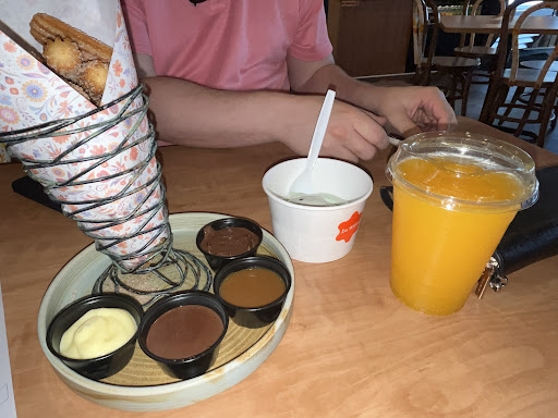 Saw this place on Instagram when it first opened and I have been wanting to try it. We went at 10pm (an hour before they closed) and they were fairly busy. We were able to put in our orders through a kiosk and did not have to wait long at all. We chose dine in and our churros were brought out within 10 minutes. There was a station near the front that had napkins, spoons, and forks we were able to easily grab for our dessert. When they came out they looked amazing! We got the pistachio raspberry and the gansito (chocolate filling with strawberries and meringue). Both tasted great but we were surprised when we cut into the pistachio raspberry churro it started leaking sweetened condensed milk and it tasted so good with the churro. The inside was decorated very beautifully and filled with historic Mexican art patterns including the chairs. Lots of picture friendly areas and lots of seating available. Even on the outside there's a window that's wide open that you can watch them make the churros. The staff were really nice and explained what each item had on it. We only got the churros this time since we were already stuffed from an earlier dinner but I would love to come back to try their gelato and...