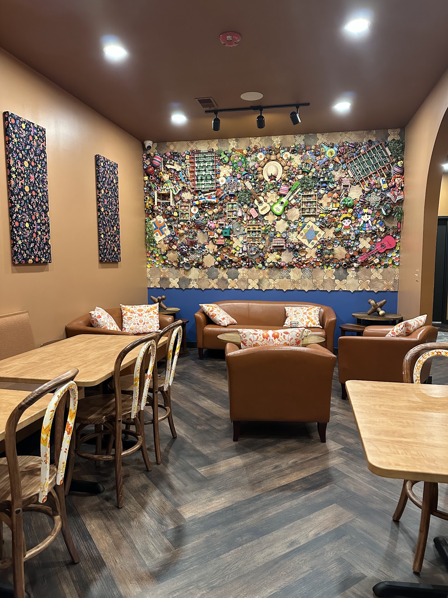 The decor is beautiful and cool to have so many cultural pieces. They sell some local items. The only gripe I have about the logistics is there is a very small foyer to the entrance/exit and it is where the kiosks are. So you have to scooch around ordering customers in order to exit.