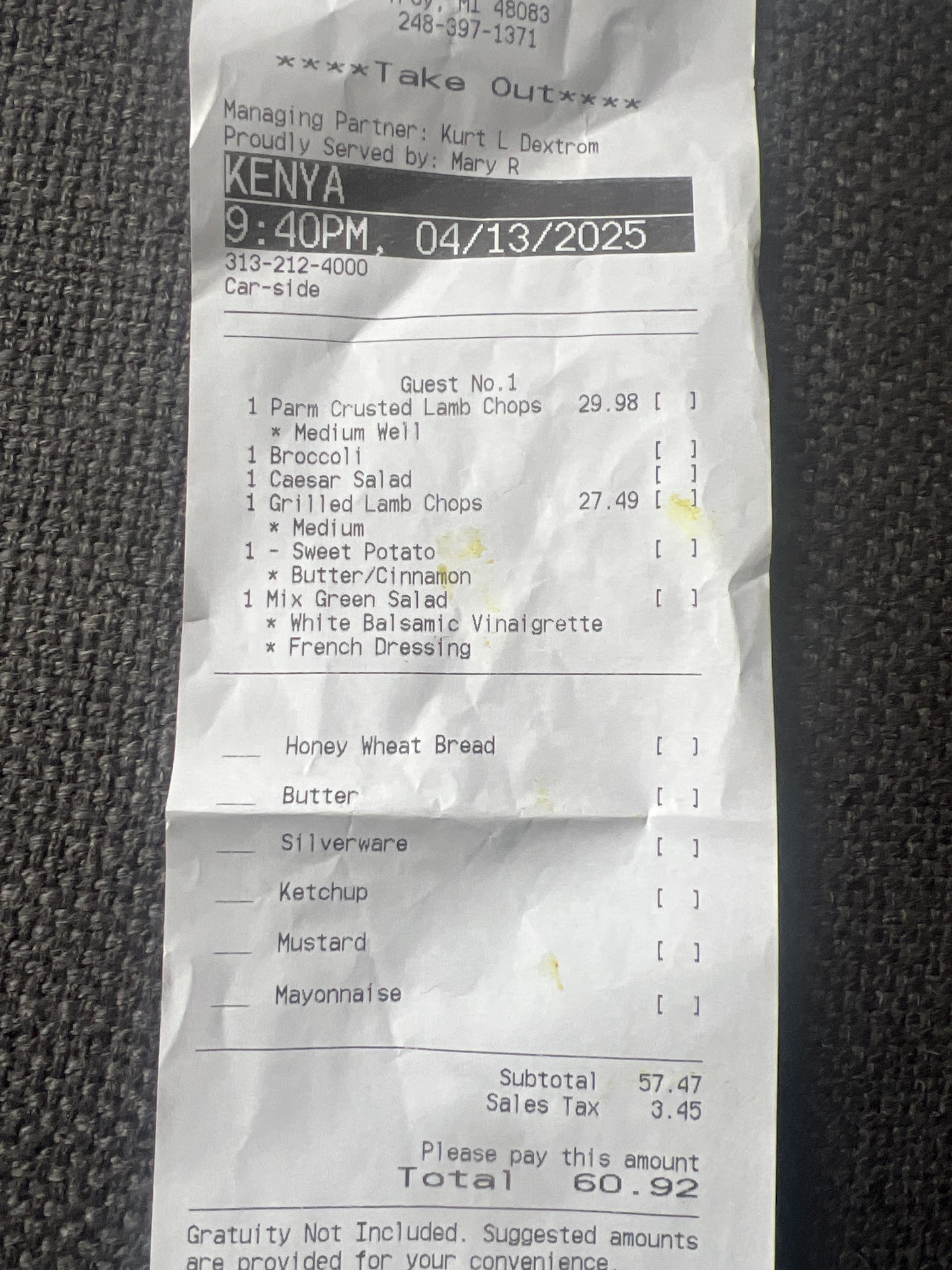 Read moreMy first and last time at this location. My sister and I came because I heard they had lamb chops. I made a reservation so we were quickly seated but this is where it went downhill. We got seated across from the kitchen (that you could see basically the whole kitchen when they came in and out) this should've been my first sign to leave because that kitchen looked horrendous! The trash was past overflowing, the floors looked very dirty and everything just looked disheveled. It took about 15 min for them to bring bread out, so at that point we ordered some appetizers and 2 margaritas. The drinks came and she left the extra bit that was still in the shaker on the table so I could pour the rest in when it got low. We then put our order in (Still waiting on appetizers). I then took a sip of my drink and it tasted super watered down (I'm not a big drinker so I didn't mind it didn't have a strong alcohol taste) but didn't think anything about it. We get our entrees and THEN 10 min later they bring out the appetizers. We sent it back cause we already had our food. I ate my salad first before I started on the lamb chops. They looked absolutely delicious...until I bit into it. I always order meat medium-well and these were rare!! Upset at this, I asked for a manager. While waiting on the manager, we noticed the couple sitting behind us was talking to the waitress about their mixed drinks. She then came to our table and asked us if our drinks had any alcohol in them...I took a big sip of my drink and it dawned on me that there was no alcohol. I figured maybe it was watered down from the ice so we drank the remainder she left in the shaker and sure enough there was NO ALCOHOL in it. The manager finally came over and he agreed to make my food over and didn't charge us for the drinks and gave us a free dessert. Even that is not enough to make me return to...