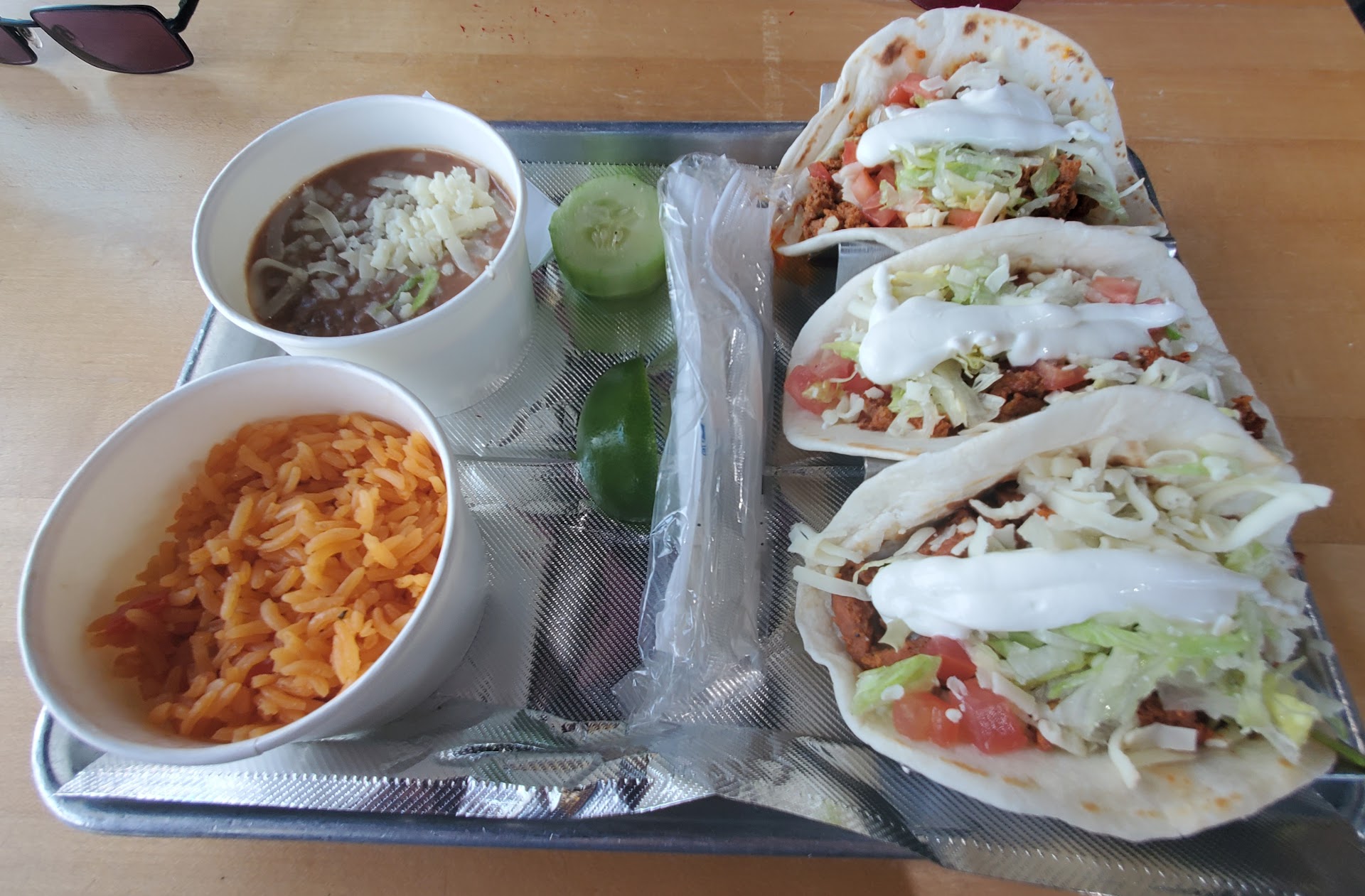 Read moreIt's Tuesday and when I drove by my mind screamed "TACOS!". I listened. Nice menu, solid selection. The woman who took my order was pleasant & reasonably helpful given English is not her first language. Table was sticky, though. I ordered the #10 Flour Taco Supremes (almost $16 w/tax), 2 pastor, 1 with chorizo. I like the chorizo more but it is noticeably greasy. The food came quickly and as requested. Beans and rice are in paper containers, not styrofoam. Could've been hotter temps but the food wasn't cold by any stretch. There is a tray of basic taco sauce packets but the heat of them is wimpy. No jalapeño or habenero options. Not until after I finished did I see the bottles of sauce on literally every other table. (No points for observation skills today). Everything is less authentic than I'd prefer but quick and tasty, for sure. I'll gladly come back, try something different & sample them sauces. A bit noisy inside, mostly the customers, should've gone outside. 14 spaces in the lot, 1 is handicapped. Street parking...