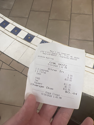 Ā Ā Ā Read moreI just visited the Starbucks inside of the Somerset Mall and just know thatāll Iāll never return, the person taking my order was rude and rushing and Iām pretty sure that I paid for 2 large lemonades and received 2 small ones. She dropped my change on the counter and instead of handing it to me she looked at me and said nothing but have a good day. The polite thing to do would have been to apologize and pick it up and hand it to a customer. The place was also not very clean, the counter where you pick up your order was sticky and dirty and my 8 year old dropped his straw on the counter and after seeing how dirty the counter was he refused to use it although it was in paper. Please speak with the employees before you lose customers. I have never had a bad experience at Starbucks but this one I...