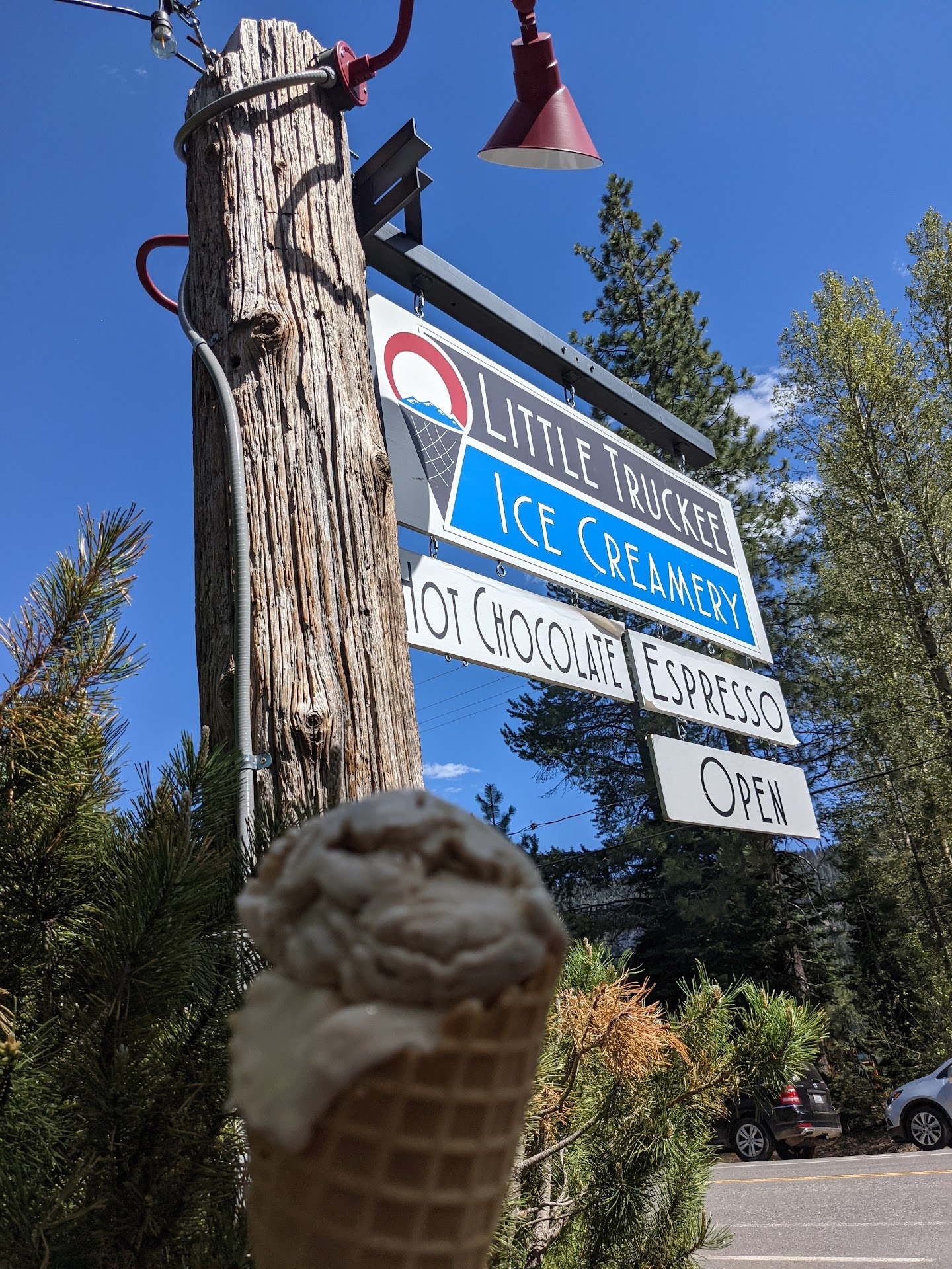 My wife and I were up in the Donner Lake area yesterday to do a little hiking and get out of the smoke down in the foothills. Afterwards she suggested getting ice cream at the Little Truckee Ice Creamery. It had been highly recommended by a friend of hers. We gave it a try. Seems like a nice friendly place with limited parking. Good outside seating arrangements. I ordered a half/half single scoop of Dark Cherry and I think Toffee on a cone. I mentioned the cone twice. My wife ordered mint chip in a cup. I got mine in a cup. After reminding the server she politely said she could put a cone on top. Cool. My wife liked her ice cream. Neither flavor of mine really stood out, tasted lack luster, and wasn't heavily laden with pieces of toffee or cherry. My wife tasted mine and said she really couldn't taste what it was. As I dipped into the Dark Cherry on the bottom I hit something hard with my teeth that wasn't going to be crushed. Looking at it I thought it might be a piece of cherry pit, but couldn't be sure. Well, nothing broken, so no harm no foul.
