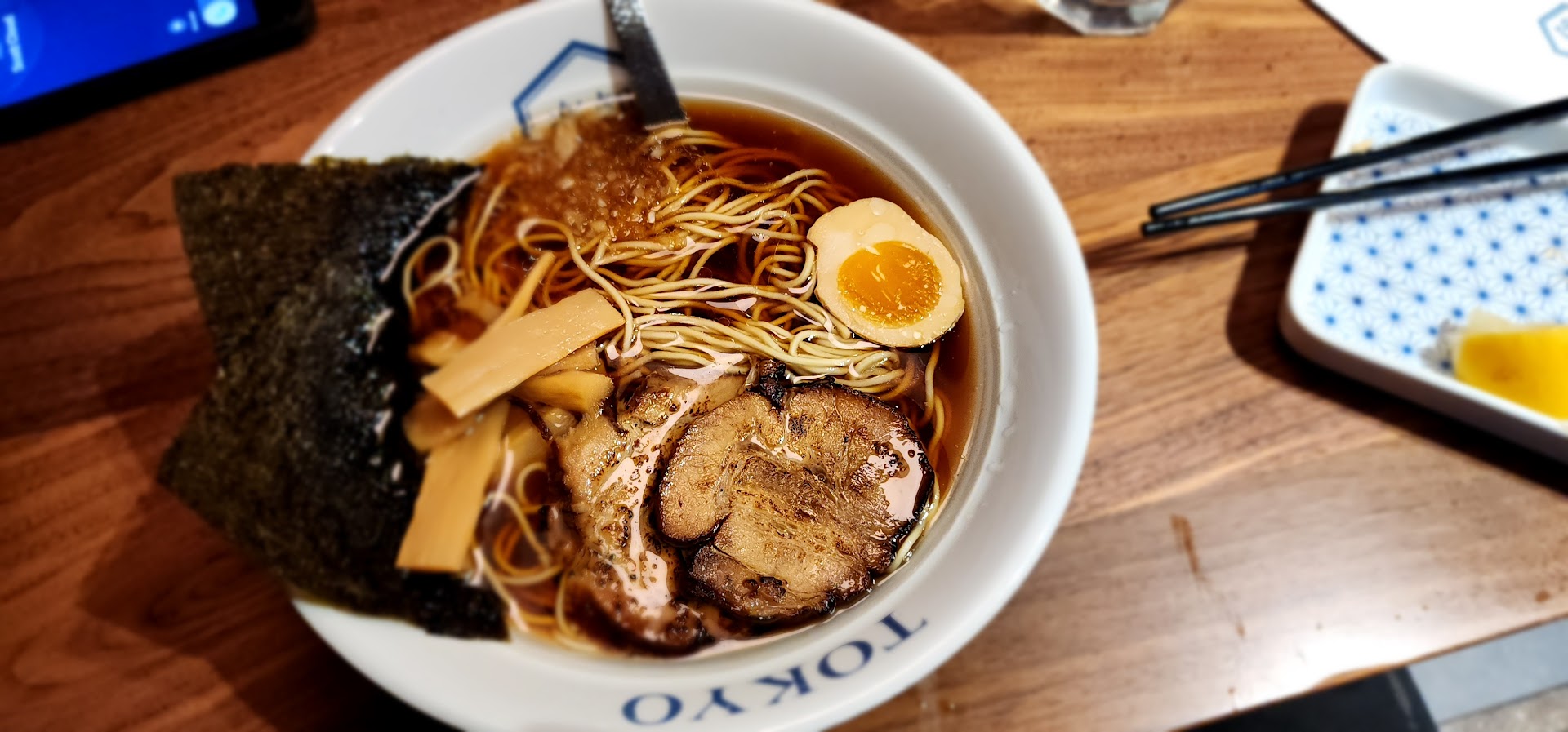 Read moreWe went in for a casual comforting dinner after a full day at Lake Tahoe, and we did get that. When we walked in, there were two tables already sat and it seemed very peaceful. We were greeted with warm smiles and friendly attitudes and seated right away. Shortly after we sat down, family after family after family came in- only with one server for all fifteen tables. Kate is Super Woman! She walked calmly from table to table, swiftly taking orders, dropping drinks off, and handled the big rush with graceful ease. My partner and I ordered a five piece pork gyoza to share, and a bowl of ramen each. The gyoza came out hot and swift, and was absolutely delicious, especially with a squirt of lemon and soy sauce. The food runner dropped the plates and gyoza with a clatter. My partner ordered the Amber ramen and loved every single sip of it. I had the Garnet and it was so filling and comforting especially as temperatures started to drop outside. As we filled up, we slowed down our pace, trying to make more space so we could finish attacking our entrees. The food runner came back to drop off the check and tried to take away our food without asking if it was safe to do so yet. Startled, we politely refused stating that we were still eating. He nodded silently and went back to work. In the meantime, he sat another couple across from us, who after waiting for a few minutes without being greeted by the server walked out.