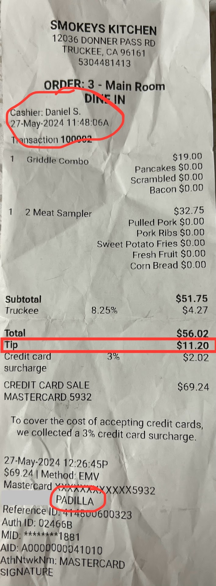 Very strange as we glimpsed at the receipt since it says it was charged on a card w a merchant service fee, and more alarmingly a 20% tip of $11.20. We didn’t want to make a scene, so we left.
