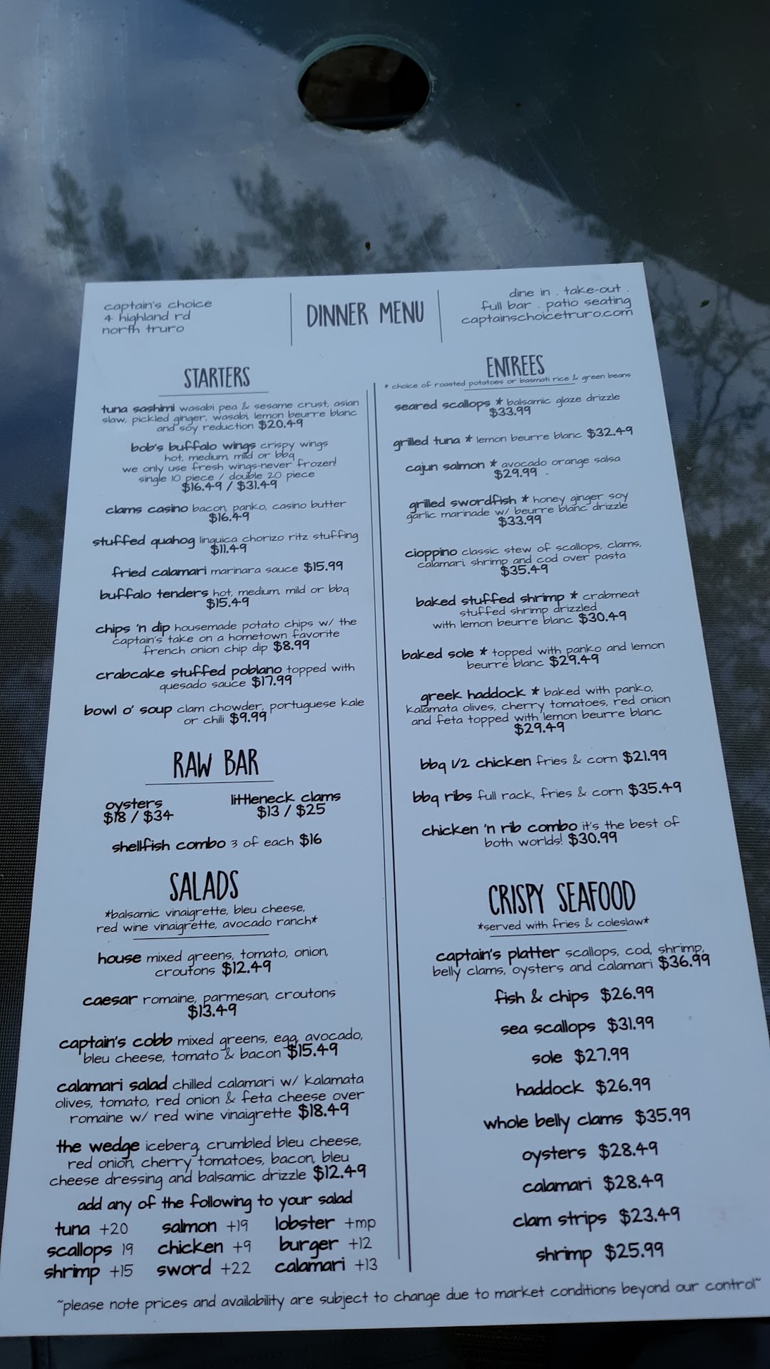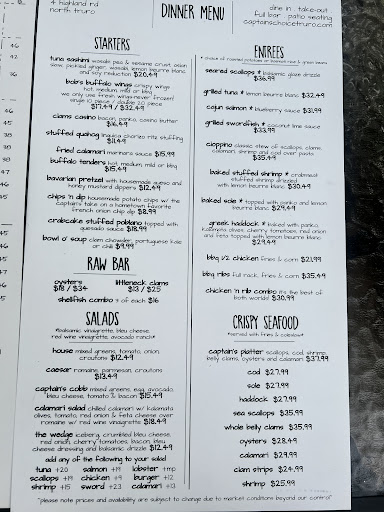 This restaurant was one of a few that we dined at while vacationing in the Truro area in late June. The off-street parking here is very limited with a few spaces in front and a few more spaces in back of the restaurant. The hostess greeted us warmly and we chose a table on the large open-air patio, although there was some seating available in the covered patio area adjacent to the outdoor bar. The outdoor dining atmosphere here is especially nice on comfortable evenings like when we visited. We were brought menus shortly after being seated. We ordered the seared scallops with rice, and grilled salmon with potatoes when our server returned a short time later. Both meals were served up very hot roughly 25 minutes later. The scallops, while not plentiful, were cooked nicely and tasted good. My grilled salmon was noticeably overcooked and dry, although it tasted ok. The potatoes were overdone as well. I decided not to send the meal back because I didn't want to wait another 25 minutes for a replacement dish, so I asked for a little melted butter to add some needed moisture to the dry salmon, and our server brought a very small cup with (maybe) an ounce of butter in it. I discovered later when the bill came that there was actually a $1.00 upcharge added for that small amount of butter. Really?!? I realize that restaurant prices tend to be higher than average in resort areas like this, but both portion sizes were on the small-ish size considering the menu prices. Our bill for the two meals, beverages, (and the melted butter), plus tax totaled a bit over $75, more than we felt was a reasonable price based on portion sizes here and prices for the same meal at other restaurants in the surrounding area. Our server, Grace, was cordial and efficient but not very engaging during our visit. Neither of us have a large appetite, but we both found ourselves a little hungry later that same night. Other than the enjoyable outdoor dining atmosphere, there weren't enough compelling reasons for us to return for another meal. Your mileage may vary. Thanks...
