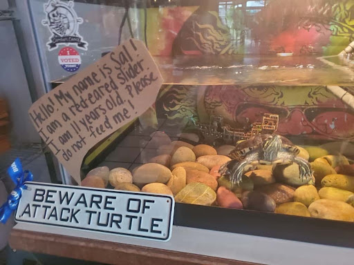 Read moreThis place definitely gives off ‘local bar’ vibes, or at least has many regular visitors in the summer. Everyone seemed to know each other! We came on a day when there was live music. It was a nice touch and the band was good (a lot of Tina Turner) but the speakers were suuuuuuper loud, it was hard to enjoy our food with the headache it gave us both, despite it being outdoors (don’t worry, we still tipped the band). Our food was pretty meh - I had a fish and chips which was not especially flavorful, kind of the American country style with the thicker breading versus the crisp British style. Cole slaw was sad, not sweet or creamy at all. Hubby got barbecue chicken which was also underwhelming. The sauce was bright red and very tomato-ey. He described it as ‘like Italians trying to do bbq,’ which made me giggle! We are raised in the South/Midwest so maybe our standards for these dishes are just very different. The service was polite and attentive. We LOVED meeting sassy Sal, the attack turtle. He’s 11 years old and so over it. Overall, friendly staff but not our place to spend Cape...