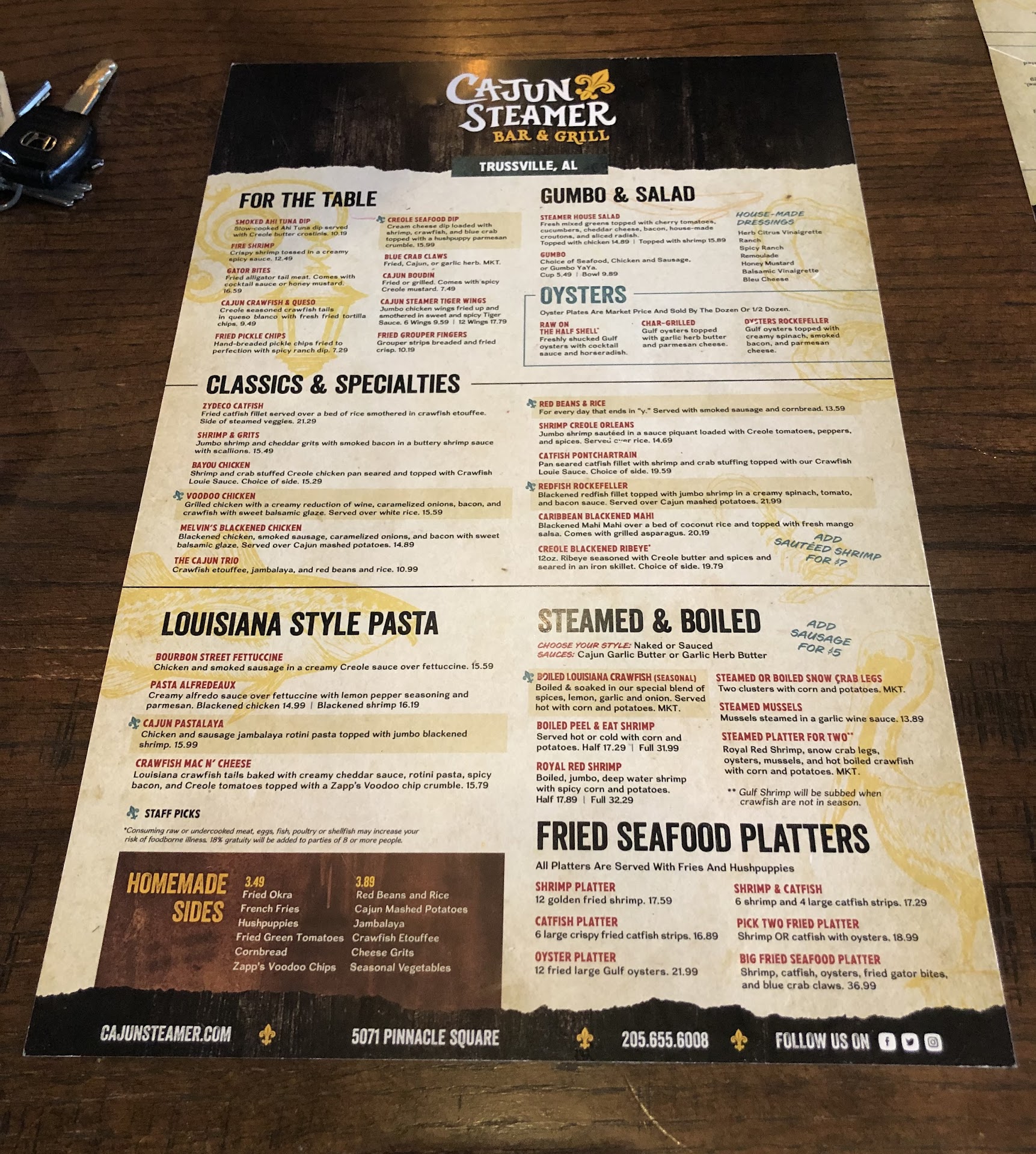 Read moreI visited this restaurant tonight and was reminded of how the far we have come as well as how far we've got to go. I ordered a dish that was over cooked and the portion size was significantly less than usual. I politely informed the waitress that I was not happy with the food and didn't want it. Her demeanor was as if we were disgusting to her and if she could set me on fire and get away with it she would. I assured her that I wasn't upset I just didn't feel the meal was worth the $27.98 I was spending. She goes and get her manager who was VERY LOUD and disrespectful to me in front of my teenage boys. After I wouldn't give him the satisfaction of an argument he threatened to call Trussville police on me. I had not eaten from the platter and could not understand the problem, but I had to set an example for my boys. This MANAGER clearly tried to provoke me into rage. Literally degrading my intelligence and hollering at me. I politely asked him to please not make a scene by loud talking me. He was LIVID that I was only willing to pay for what my sons had eaten. He literally stood over me while I was sitting pointing his hands in my face and over our food on the table. I could not believe this was really happening. I told him yeah call Trusville police. He screamed,"not a problem. I will!" So my sons, scared out of their minds, tried to convince me to pay and lets leave. I told them we did nothing wrong and just relax. While waiting for the police to arrive I called my wife to inform her of what was going on. About 15 minutes later he comes back with my bill with the item removed from the bill, acting as if he was a professional. Why he decided to treat me like this I don't know but, I'm willing to bet my skin color had a lot to do with it. It was the look in his eyes and the way he talked down to me. My sons have been scarred they've heard about this on tv but has never experienced this in person, but more importantly I had to be that example for them that they don't have to lose their cool to prove a point. NO worries Trussville Cajun Steamer... I will NEVER step foot in your store again. I'm one less you don't have to bother...