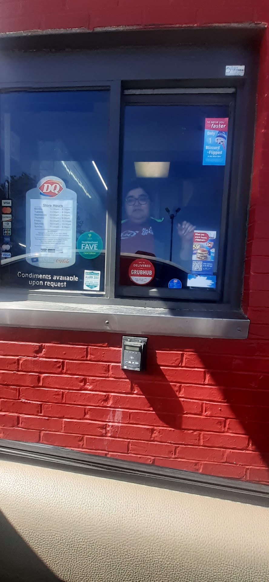 Took my daughter here Saturday Oct 15th, the girl at the window was so rude I could barely place my order she made rude remarks like uggh hurry up as if I couldn't hear her I was placing 3 separate orders she kept smacking her mouth the whole time. My mom was so angry we never placed the third order because we couldn't tolerate her stupid, immature, ignorant behind any longer. We bought the kids for blizzards but left without them couldn't even look at the menu she was so rude, and had the nerve to hide behind a young man when we pulled to the window. He was very polite I can tell he was angry with her behavior. The name on my receipt says Aamir but I don't think she is Aamir. The young man was polite she...