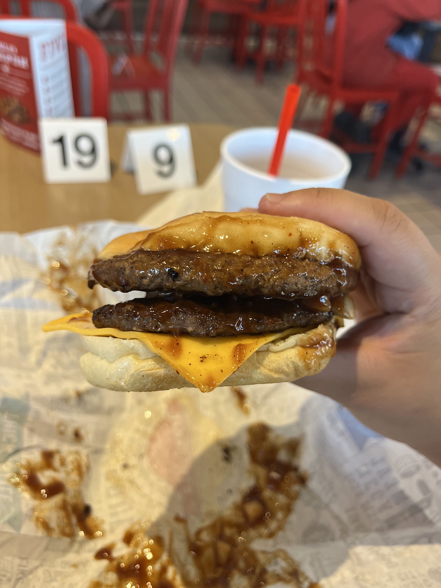 I saw the workers in the kitchen pick up food that they'd dropped and attempt to put it in customer's orders that they were putting together. The table we tried to sit at had half-eaten burgers on the floor underneath it, and the surface looked like someone just took a napkin to it and "wiped" it clean. The only place that seemed semi-clean was the women's restroom; and even then, there was toilet paper on the floor and the garbage can was overflowing. Needless to say, we ended up just taking our food to go and ate at the hotel we were staying in.