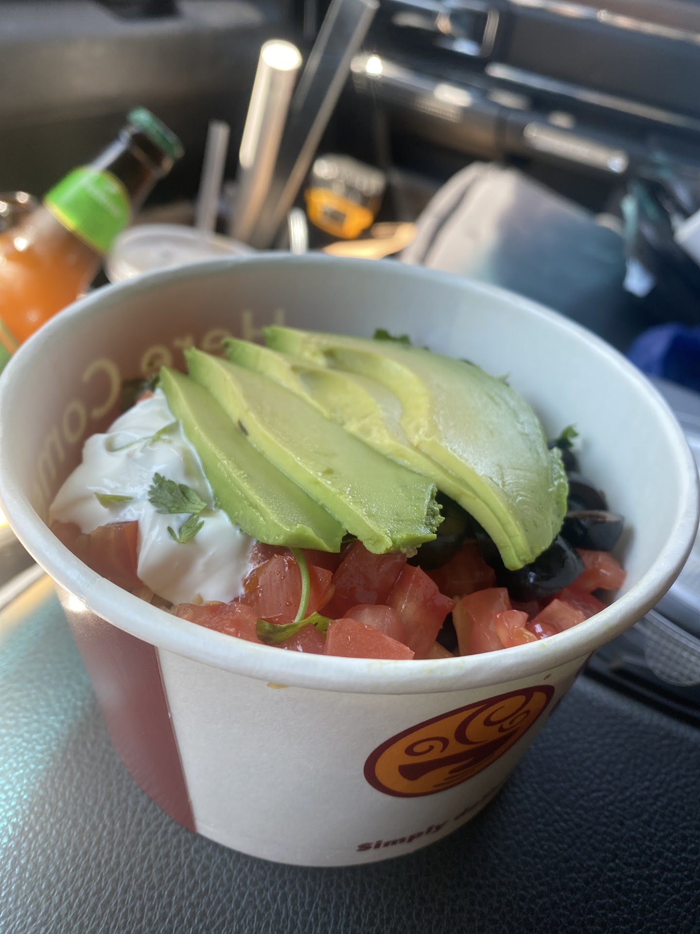 However, this week, I noticed that I ate the whole thing. Strange, okay. Today I looked and the bowl was half full. I get it through GrubHub, but the very top of the bowl - rice, avocado, chicken, all of it - only reached the halfway mark on the container it came in. And it is definitely the same size container that it usually is. I would know - I get this a lot. Not only that, but I had two pieces of chicken and two slices of avocado. Something is definitely off.