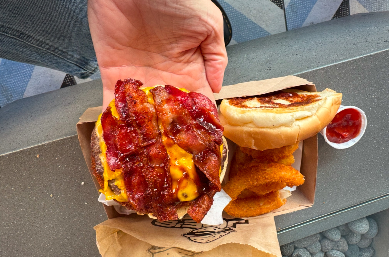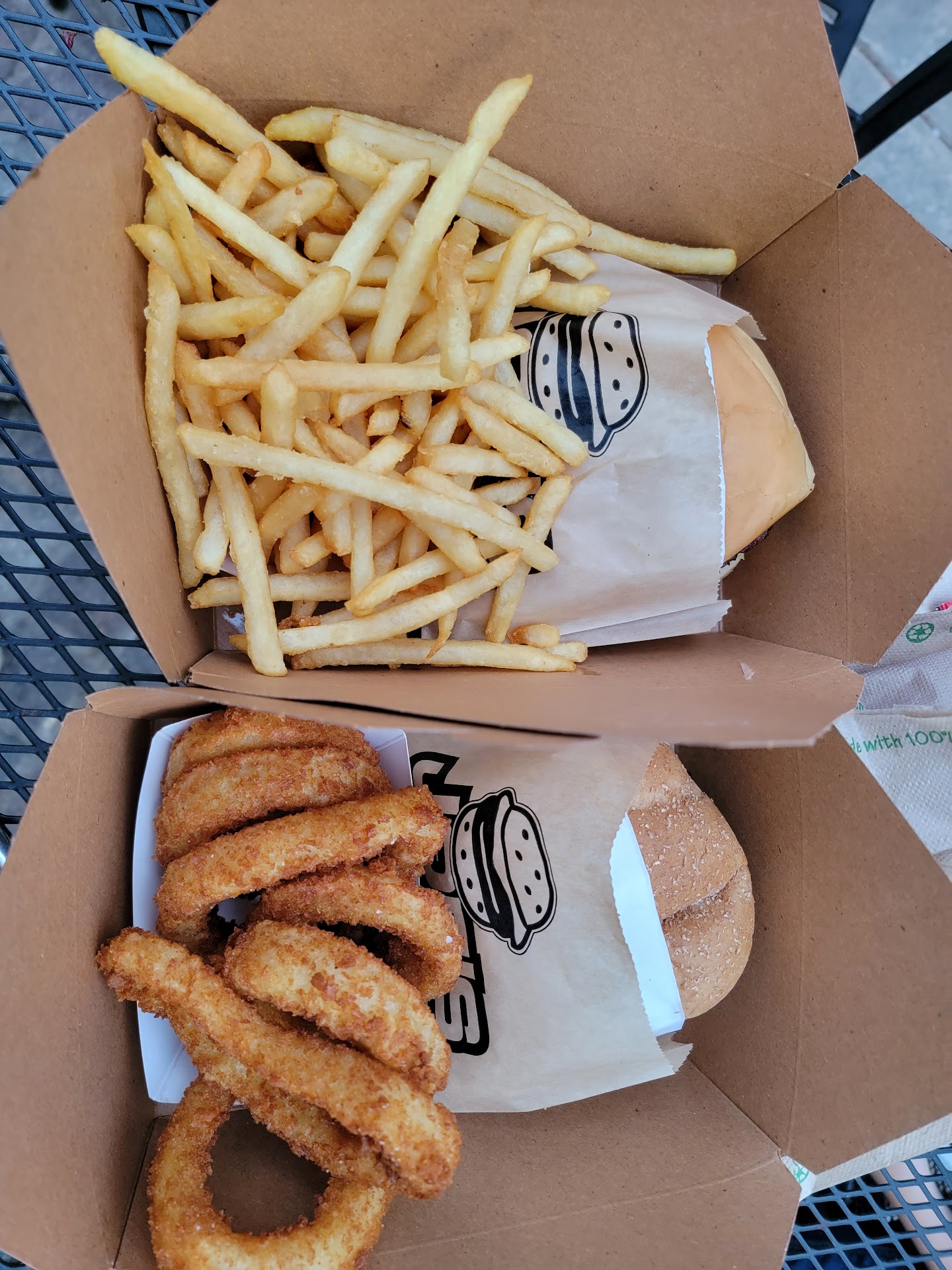 Read moreFairly decent burgers and deep fried French fries and onion rings. Wished they had malt vinegar for dipping fries with. They had Ketchup for the kids. Drink was small cup and they only put a lil bit of ice which was appreciated vs the way some establishments do and it's all ice in a small cup. We waited probably at least 10-15 mins for our food to cook after ordering but only a few minutes to order around 5-7 mins in the queue, they said they were short staffed. We sat ourselves in their bistro style table and chairs and when our device lit up and beeped we were happy to pick up our order. Friendly staff from the one who took the order to the one who handed us our food. Great area close to shopping and nice area to walk around albeit construction is happening...
