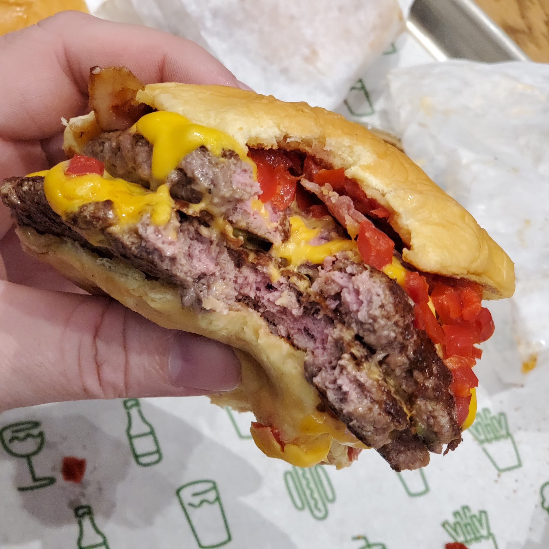 The wait for our order was a little long, but not crazy. Maybe 10 minutes. The burgers were good, if not a little small for the (quite high) price. They're typical smash burgers, with thin patties, slightly crispy around the edges, soft buns and plenty of grease. They give you a lot of cheese and a decent amount of whatever toppings you order. The shakes were really great, though they did leave us wishing there was a bit more.