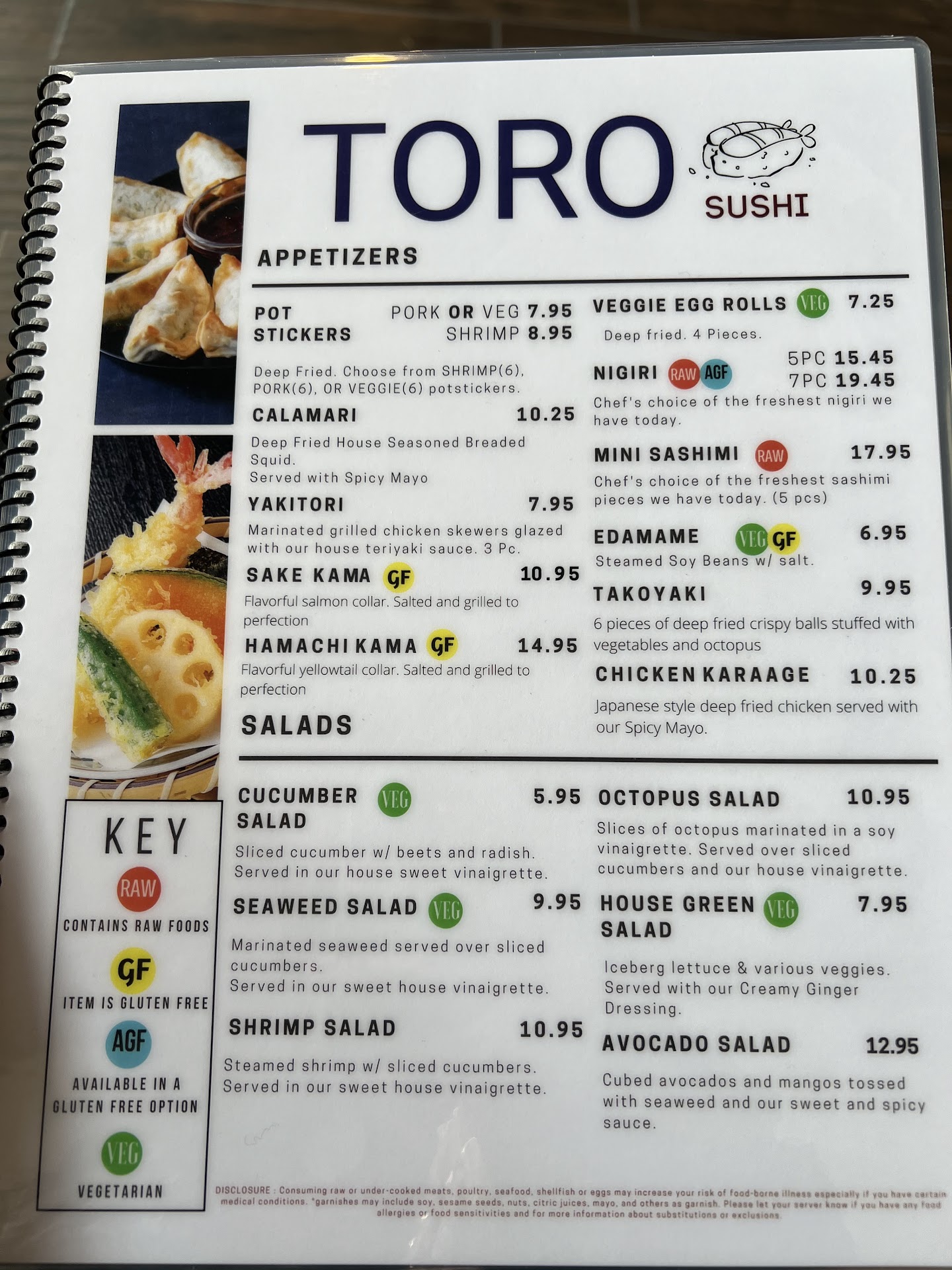 Read moreToday's visit was my fifth time with my wife in this lovely & friendly sushi restaurant. As I entered through the front door I first noticed that the decoration was tastefully done throughout out the entire hall with a very clean environment. Waitress was always super friendly and made us welcomed at this cozy place. We ordered tea as usual and they were served promptly. We started with miso soup and Octopus salad, and they were very refreshing and tasteful. We ordered 2 sushi rolls, several sushi, and sashimi (see picture). Their sushi & sashimi were always fresh, and they never disappointed me in the quality of the fish. That is why my wife and I've been coming back to Toro Sushi repeatedly. My wife could not eat anything gluten due to her ciliac disease, and the waitress and the sushi man made a special effort to accommodate the food for my wife, and she throughly enjoyed the food without any issues. We are so thankful for their extra effort to take care of their customer. We feel right at home at this friendly restaurant, and we recommend this place for all sushi lovers!!!
