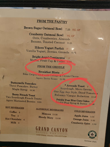Read moreWife and I are staying in the village and went to eat dinner here - no wait, got sat down fairly quickly and had our drink order taken and served almost immediately. Wife got coffee and it was cold like it had been sitting out since breakfast. That was rectified and we ordered dinner. Wife got the fish and chips, and the fish was cold/undercooked (one felt like it was barely unfrozen). Ended up getting comped a free dessert by the waiter, but it was overall a pretty rough experience for how much we paid for the meal and how much we're paying Xanterra to stay on their property. Add to that the fact that it's not peak season, the restaurant wasn't very busy, and there were a large number of hosts, wait staff, and bussers standing in groups gabbing out in the open and milling about - this place seemed poorly managed. Don't get me wrong, the staff was friendly, but if you have a bunch of people without stuff to do, get them something to do or at least get them out of sight of your customers so when mistakes happen it looks like a one off instead of it looking like no one's running the ship.