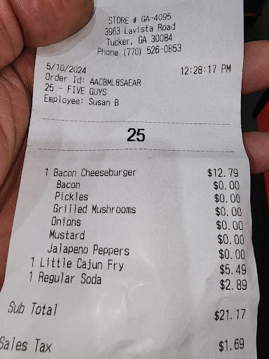 Ā Ā Ā Read moreI made the mistake last night of going to Five Guys to grab food for my family. I ordered three plain bacon cheeseburgers and two orders of fries. I asked the young man taking my order to confirm he heard me when I said "plain." He said he did. I then waited an extraordinarily long time for the food, sitting with a bunch of irritated fellow customers wondering why everything was taking so long. I should have asked for a refund and left but had already waited so long, I didn't. A woman called my number and handed me a bag. "Three plain bacon cheeseburgers and two fries, correct?" I asked. She said yes. I looked at the bag, confirming my ticket stapled to it confirmed the same. I saw two fries and three burgers. I got home and found -- zero bacon cheeseburgers. Instead, I found three nasty burgers with different combinations of stuff on them -- all of which me and my family hate. I was too tired to drive all the way back to the store and sit there for another 30 minutes waiting on a replacement, so I had no choice but to throw the burgers away. There was no way to get all the nasty mushrooms, sauces, and other stomach-turners off the meat. So I paid $60 for horrible service and food that went to the garbage. Thanks for...