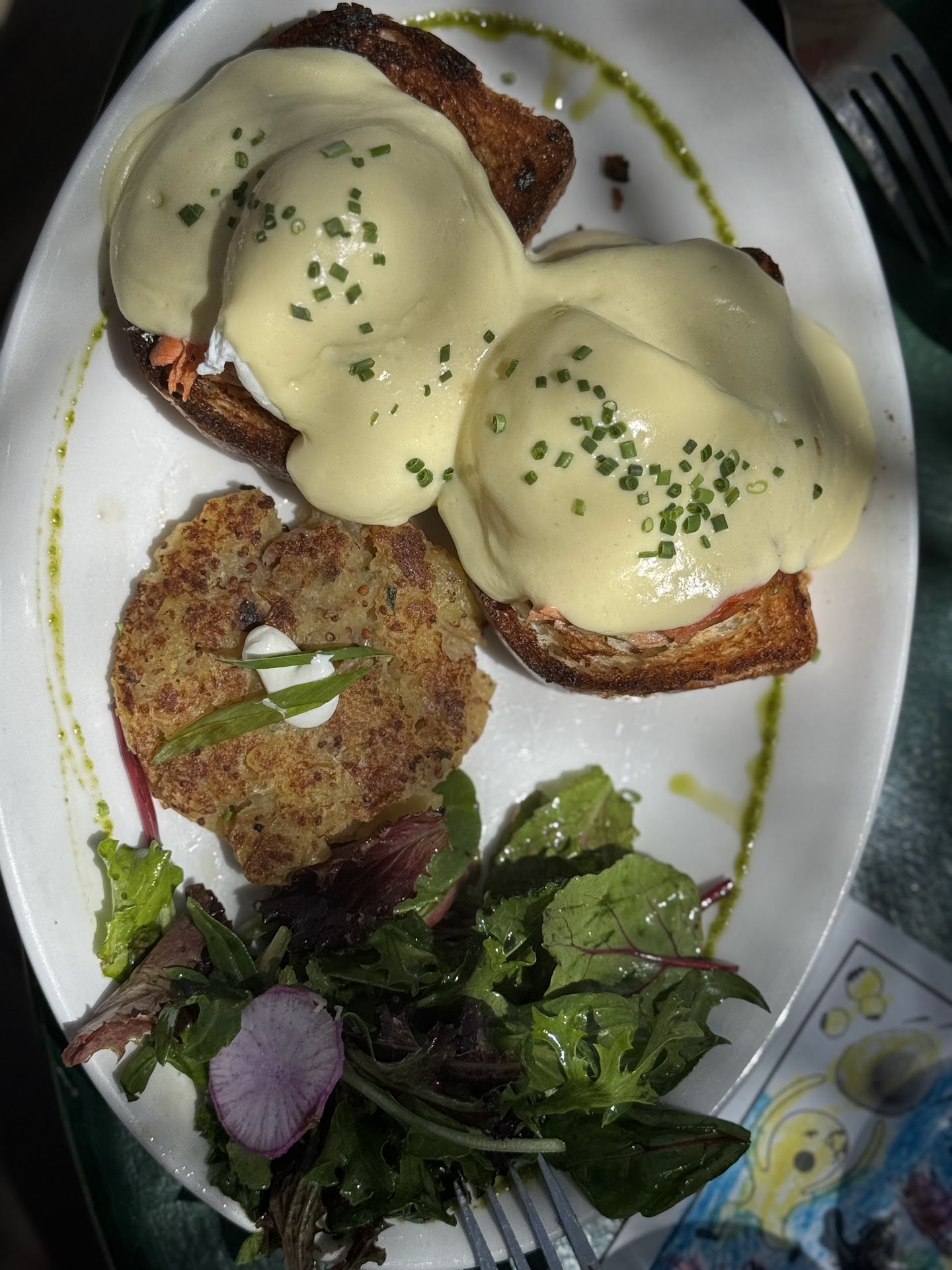 On this visit, I ordered the smoked salmon eggs benedict. The presentation was impeccable: it came with a fresh salad dressed with a house-made balsamic vinaigrette, a delicious potato cake with mustard seeds, and the main event — two perfectly poached eggs on a house-made bread (light, airy, and perfectly baked), topped with a rich, creamy hollandaise sauce and high-quality smoked salmon. Everything was beautifully balanced in flavor and texture.
