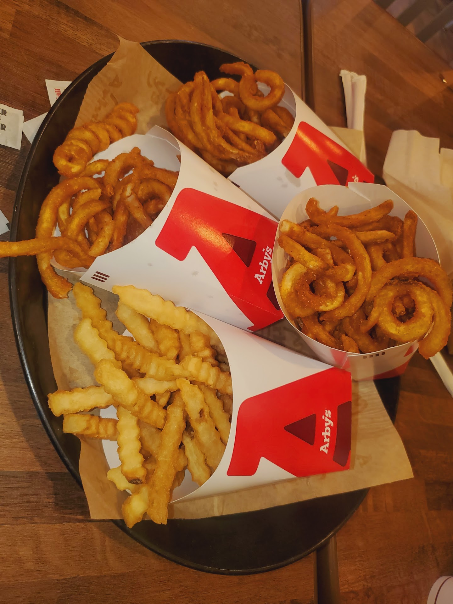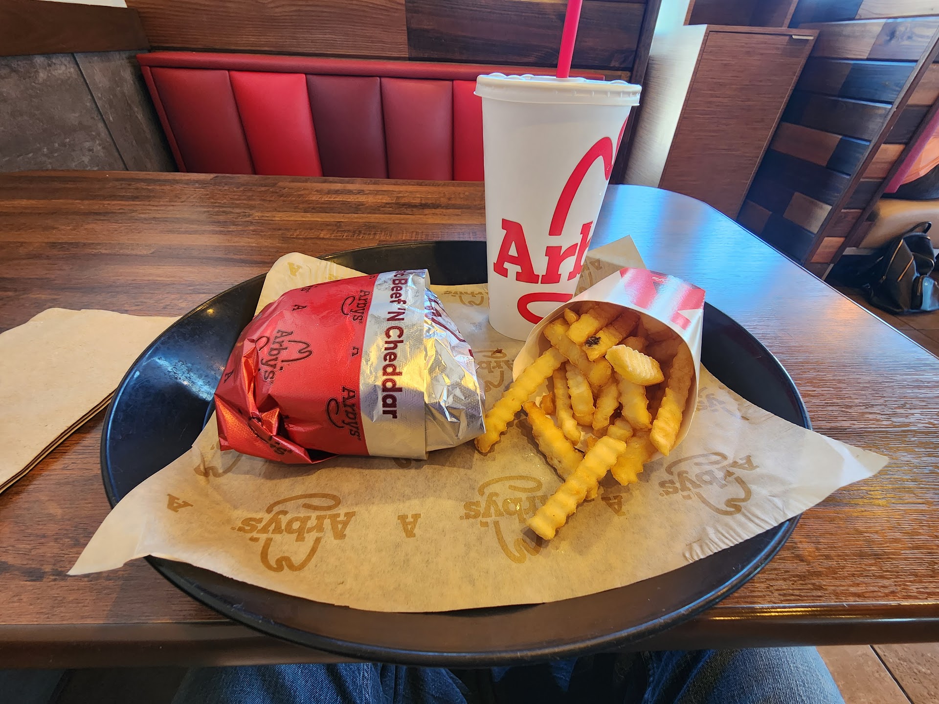 Should of ate somewhere else. I Stopped in to see this newest Arby's. The dinning room is now open to sit in and it was pretty empty. Went about 3 pm on a Sunday. Alex was our cashier and thats where the problems started. Very monotoned and didn't quite understand a few questions I asked but though nothing of it. Went to find a seat and the dining room had half the tables off limits but the ones open had left over trash on them and several others had remnants of crumbs and such so pretty unsanitary. Another couple asked Alex to come out and wipe tables so they had a place to sit. Food took a while to come out, for them being dead didn't understand this. Alex then carried our food along with that other couples food and delivered to them first. He was about to sit our tray with the other couples and had it almost in their faces, uncovered as they didn't have their face masks on, then tried to give me my food. It was wrong and I didn't feel comfortable with my uncovered food exposed to others before given to me. He took it back and I sat another 10 min before I went up to check. Found my tray sitting on the side, Alex saw me come up grabbed the tray and the items I was missing and tried to give it back to me. I then asked since not only was my try put in another customers face, it has been sitting for over 10 min I would like it remade. He sighed really loudly so I asked for his manager. Now granted she was wonderful and didn't get her name but she definitely understanding why I wanted fresh food and went to remake everything. She brought it out and apologized. Time it took from walking in to getting food was almost 30 min. Not acceptable for being a "fast food" joint. Probably won't be back to this location. Their front help need some more training on cleanliness and safe...