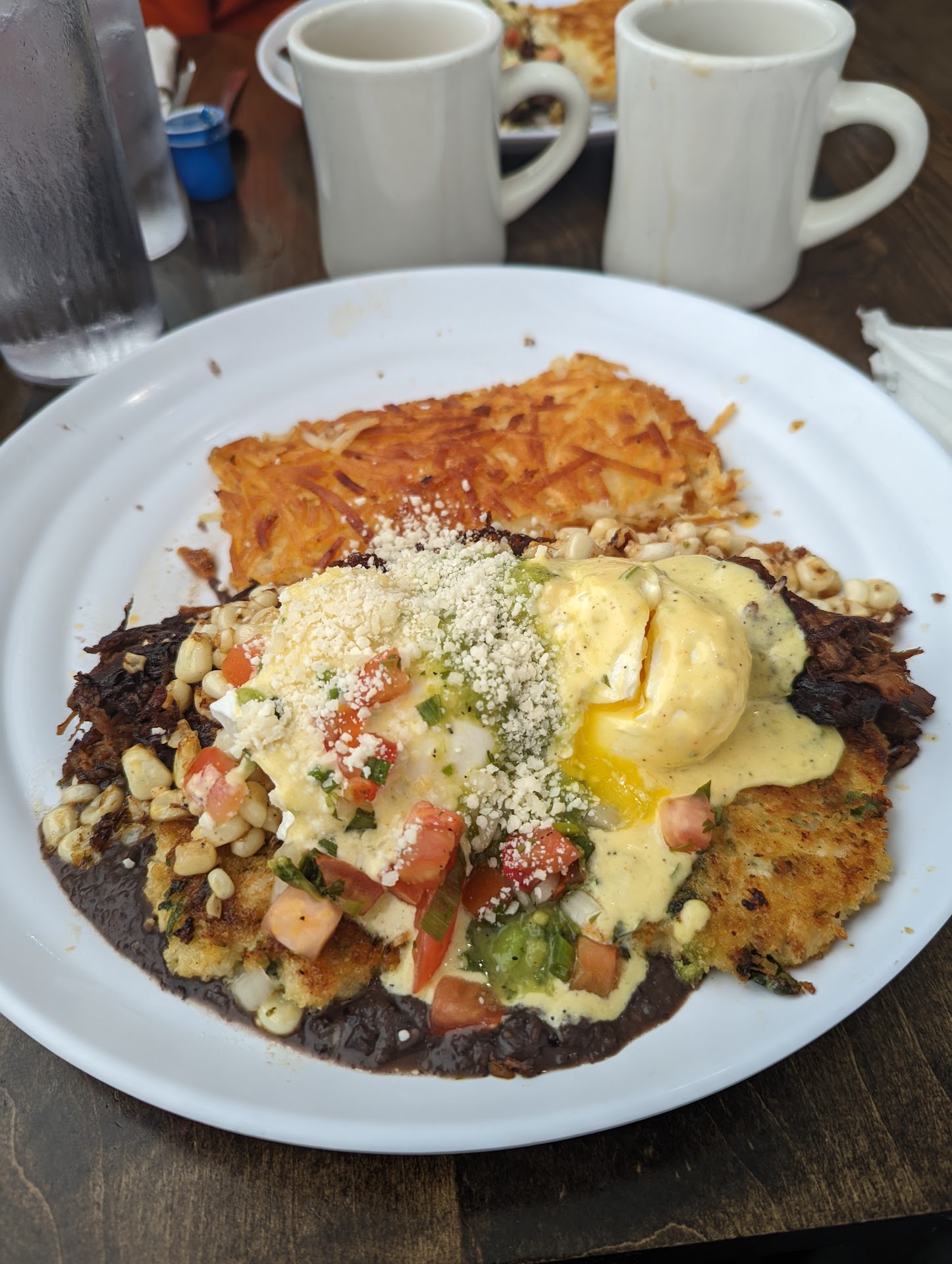 FLAVOR BOMB!!!! Lord have mercy. DefCiphur just indulged in one of the most flavorful, delicious and incredible meals ever. The 'FLAVOR BOMB' Benedict. The concoction of elements, components and flavors was otherworldly. Upon the very first bite, it was like a Flavor Bomb went off in my mouth - an explosion of multiple flavors that detonated on my taste buds. It was absolutely insane in the best way you could ever imagine. Grilled hominy cakes over a black bean sauce with poached eggs and Southwest pulled smoked short ribs (which later we discovered that the cooking process takes over 21 hours). Say what?! But wait, there's more. Throw in some elote! Can't stop there - how about some avocado hollandaise, salsa verde cruda, pico de gallo and cotija! Garnished with some crisp corn tortilla chips! FLAVOR BOMB!!!!!!!!!! On top of all this, we were looked after by an awesome human being named Anna. The big bonus was that we were blessed with the opportunity to be able to speak to the owner 'Gerard' who shared some inspirational stories about the early days and come up of Baja Cafe. Incredible stuff. This institution is a gem here in The Old Pueblo. If you haven't been here, please come visit and by all means, feel free to have a Flavor Bomb go BOOM in your mouth. My name is Ciphurphace and I approve this message.