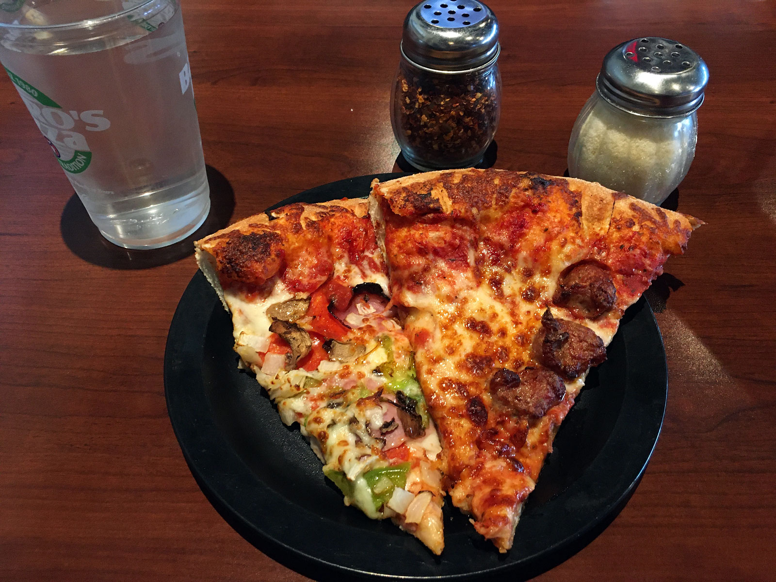 You queue up to order at the counter, where you’ll either be served immediately or given a number table stand so they can bring out your order when it’s ready. Lunch hour, so I went with one of their specials, #6 — three slices & a small drink, one slice each of pepperoni, sausage & the Barro’s special. Paid by card and amazingly, no prompt to leave a tip! Yes, this restaurant doesn’t panhandle / guilt their counter-service customers for 25% handouts in the guise of showing appreciation for their staff for simply doing their jobs. Lunch total was $10.05.