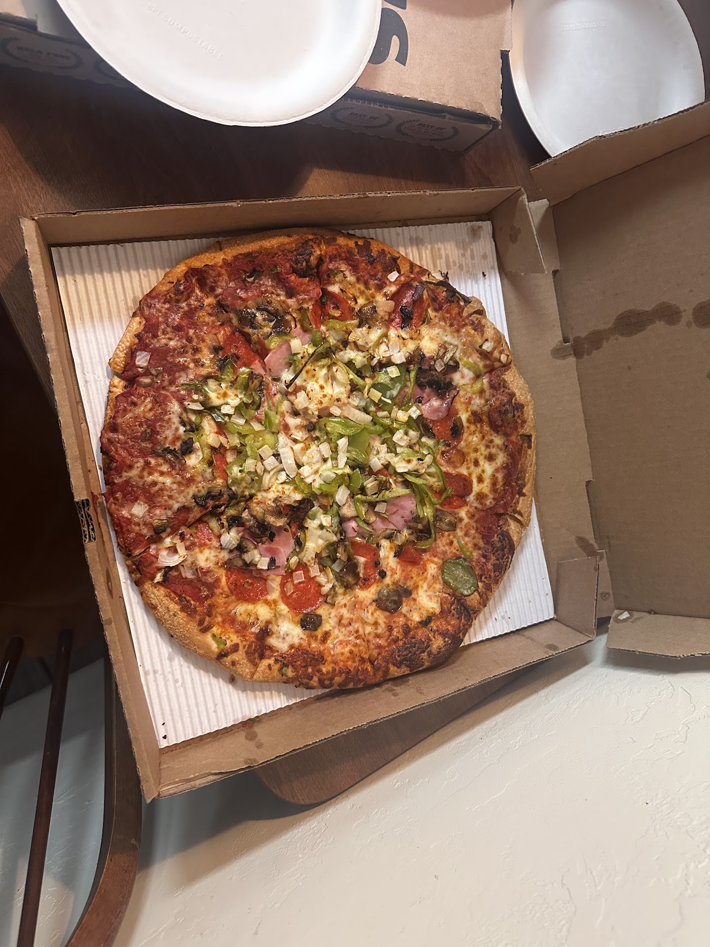 Read moreRead moreI asked for and ordered a large works pizza extra crispy. My girlfriend and I each had 1 piece and we both agreed it was definitely not extra crispy. When I nicely asked if they could put it back in the oven to make it extra crispy as I requested they said they couldn't nor did they offer to remake it either. What a terrible manager on duty. It was their mistake on my order so they should take care of their customers and get them what their customers actually ordered. Also when we were there eating that day, an elderly couple sitting next to us got their pizza and they complained that they requested thin crust for their 2 pizza's and neither the their pizza's were thin crust they were the regular crust. I know they weren't thin crust as they had requested because my pizza was thin crust and theirs were obliviously not thin crust. When they complained to the girl that handed their pizzas to the elderly couple she just flat out lied to them and said oh these are thin crust but if you wanted thinner then this you should have told the cashier you wanted extra thin pizzas and they would of smashed down the crust even flatter What a crock of lies right there. The elderly couple never actually got the thin crust pizzas they ordered and the cook instead gave them the regular thickness pizzas and lied that they were thin crust. When the elderly couple requested the pizzas to be made again as they requested the girl said it's going to be 1 hour at least because they were too busy and that the elderly couple would have to wait in line behind the other pizzas being made. Again poor customer service...