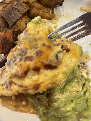 My son had a spinach omelette with fried potatoes. His also was âokay,â and he had leftovers. I tried one of the potato bits and it was cooked, but could have been a bit more crispy.