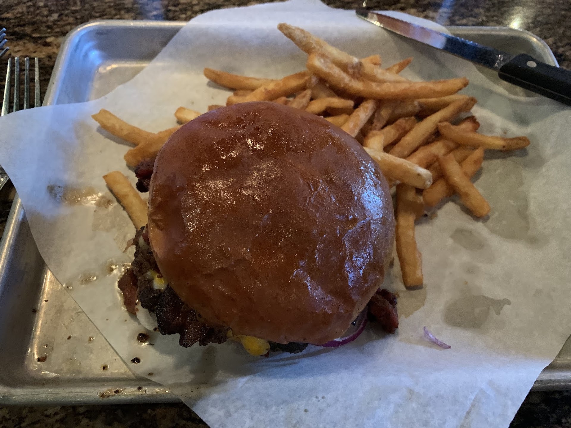 Browsing and choosing an entree, may take some time but it is well worth it. My husband and I made our choices. He chose the Nachos with chicken added and I chose the Brisket Bacon Burger. Since it was after twelve, we had a drink....not that being before twelve has stopped us.