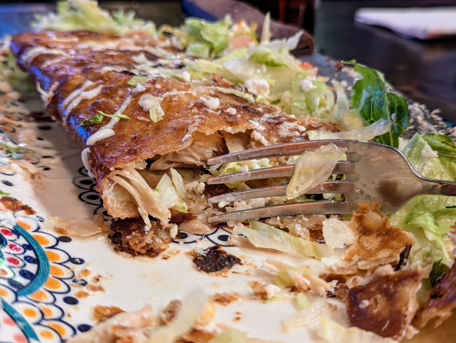Unfortunately, the food was largely disappointing. The salsa appetizer was okay, and had an interesting savory profile. I ordered a chicken chimichanga and my mom got the enchiladas. While the meat was beautifully cooked in both cases, the only seasoning on it appeared to be the lard (I assume) it was cooked in. My chimichanga was sprinkled with cheese too mild to add any flavor, bits of unripened tomato, and plain lettuce which didn't contribute much. Besides the chicken there wasn't really anything inside the chimichanga - no sauce, no seasoning - so the whole thing mostly tasted like chicken grease. As you can see from the photo, the chimichanga was very thin, so the ratio of crust to chicken was seriously unbalanced. I wasn't even halfway through before I got sick of the crust and tore it open to just eat the filling. I have no idea what the sauce drizzle on top was - it didn't taste like anything and there wasn't enough of it to make any flavor difference.