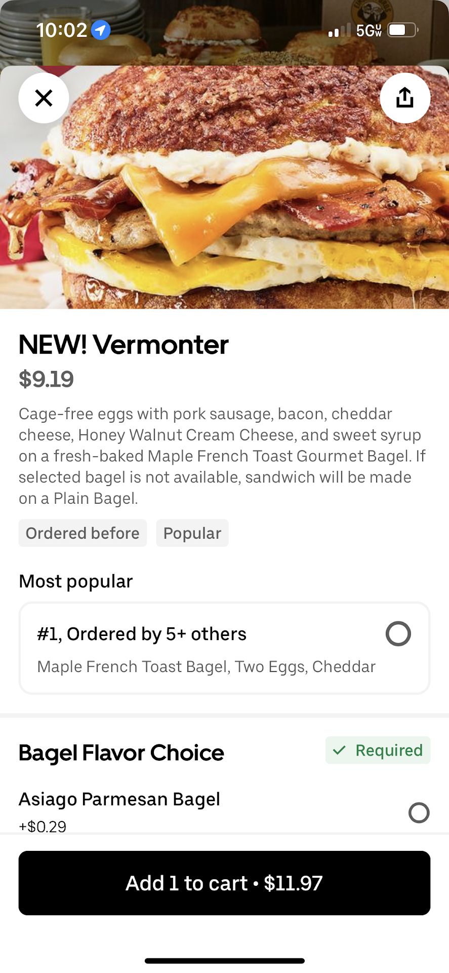 I tried the new Vermonter Bagel Sandwich which is a French Toast bagel with 2 eggs, sausage, honey walnut cream cheese, cheddar, and syrup. I hesitated for a good bit and was going to get my usual Salmon Bagel but I’m a sweet and savory girl so I gave it a try. Purr, we love a non-picky eater. And WOW! The most underwhelming breakfast sandwich Ive ever ate. So many flavors yet so little taste or maybe just no enjoyable taste? It was definitely edible but i wouldn’t ever eat it again or even the other half of the bagel I wasted because I decided it wasn’t worth the 910 calories. And personally, I’d throw it back for a breakfast sandwich. The hash brown and the Celsius? delicious. Great service and other bagel choices and I don’t want to give the shop less than 5 stars based on what Bruegger created while clearly high and when everything tastes good. Also I don’t know if it’s just the Uber Eats app or if it’s the same charge in person, but I ordered for pickup and selected the bagel sandwich of choice which had the description above. Tell me why it’s $9.19 for the breakfast sandwich but then became $15.61 for French toast bagel ($1.09) and for two eggs ($1.69). How you gonna charge me extra for something that already comes on the sandwich? If I opted out, would I have been left with nothing but paper to hold the components...